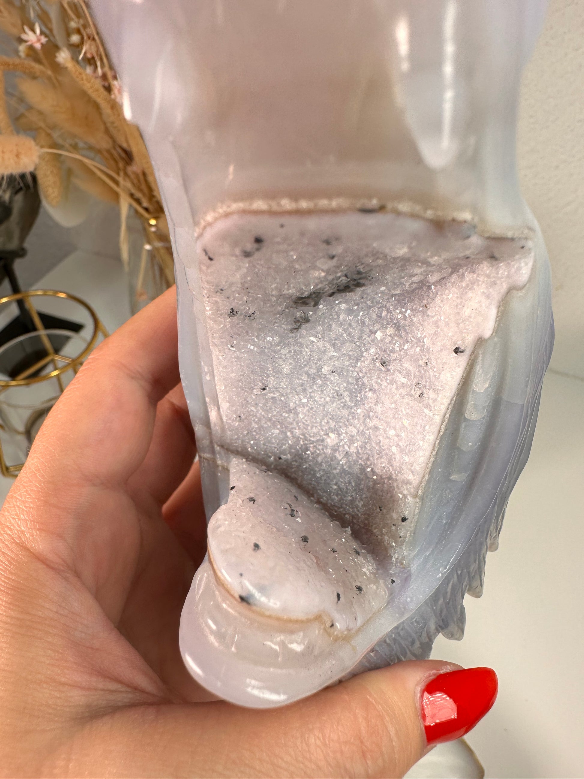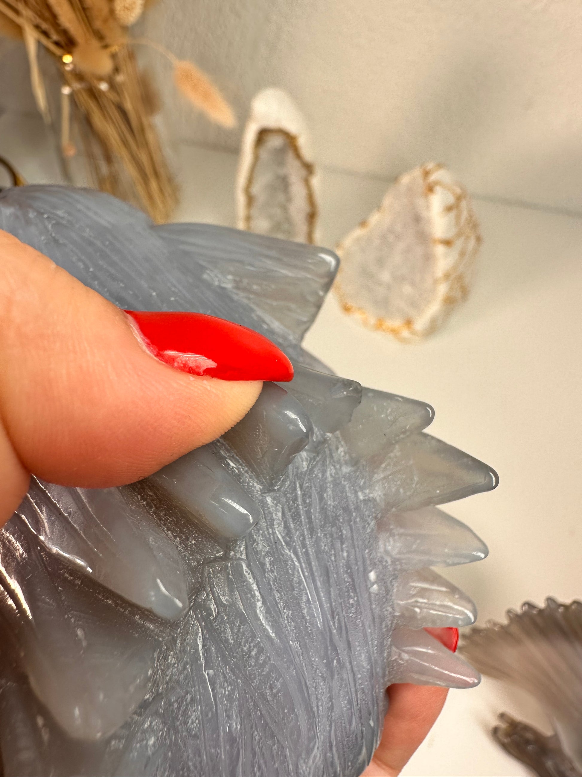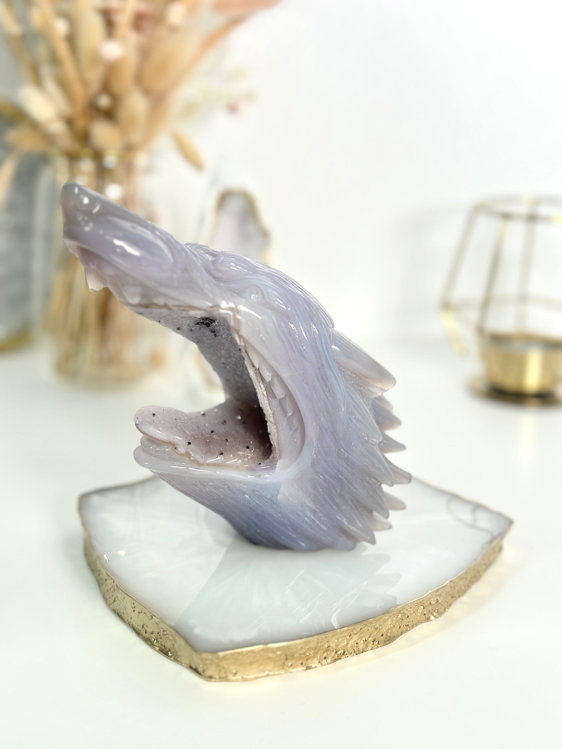 Ein wunderschönes detailgetreue Carving ist dieser Wolfskopf aus Achat.