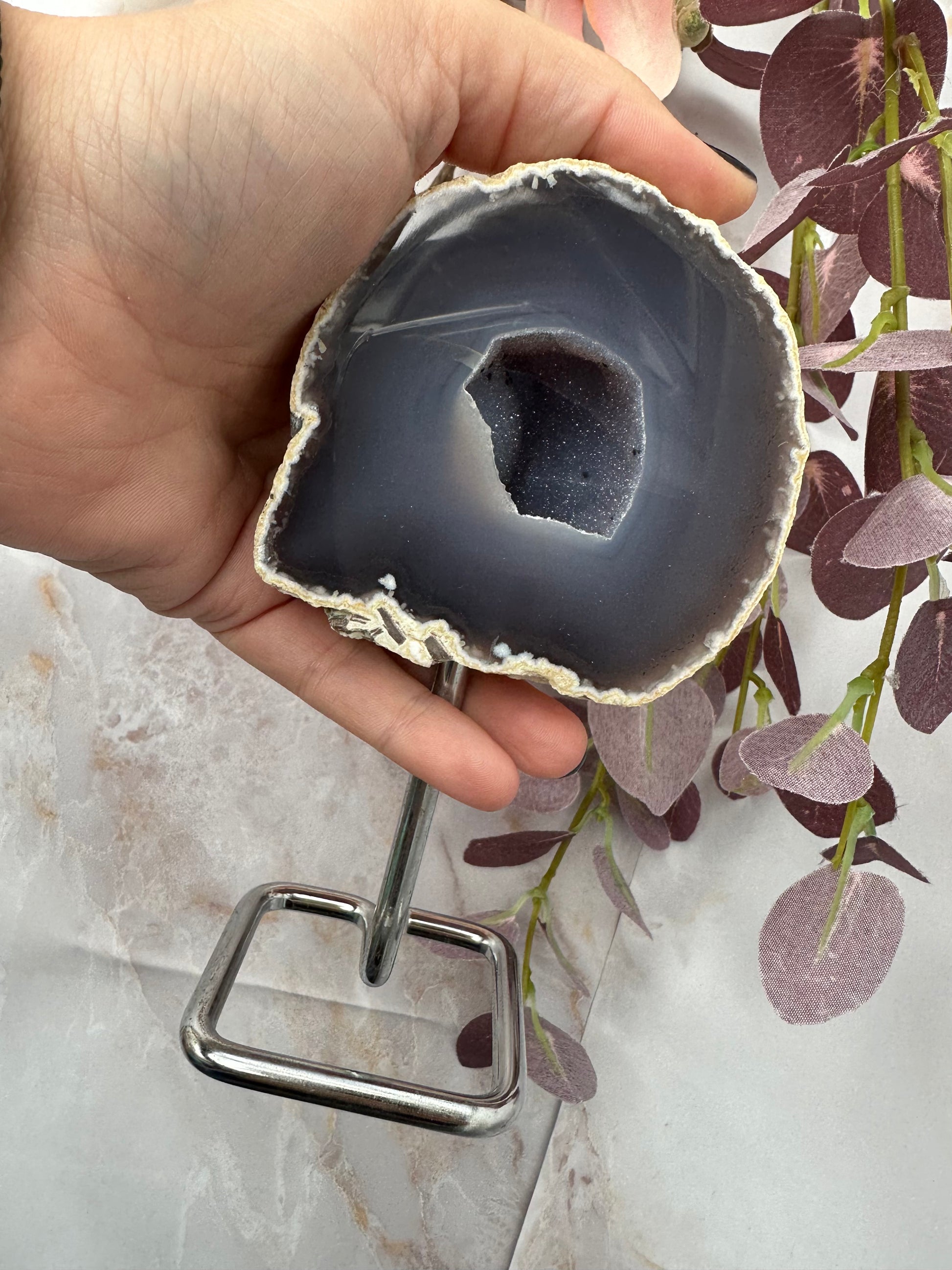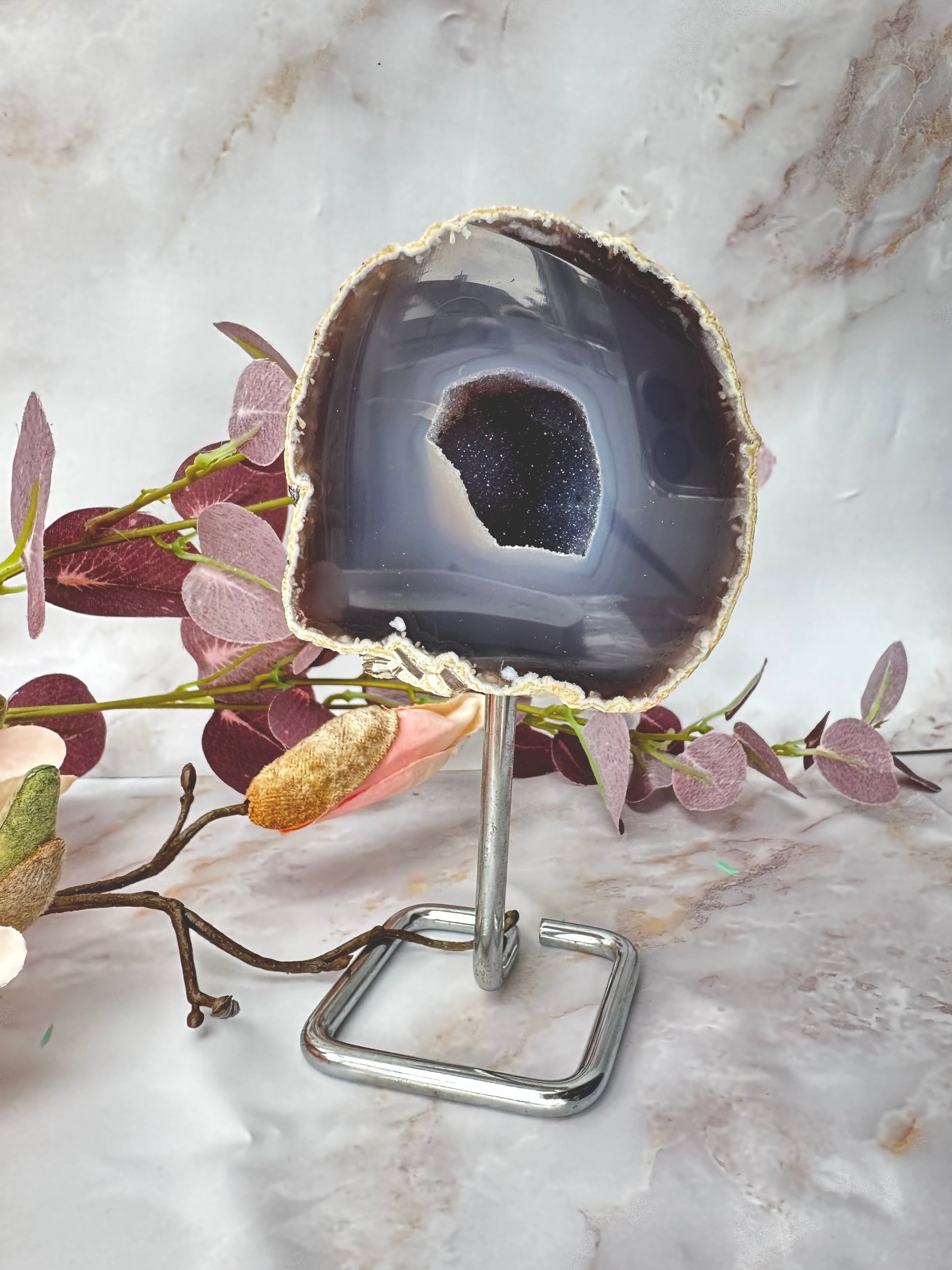 Wunderschöne einzigartige Achatgeoden, die mit ihrem silberfarbenen Metallständer ein ganz besonderes It piece ist! Im Inneren funkelt sie super schön.