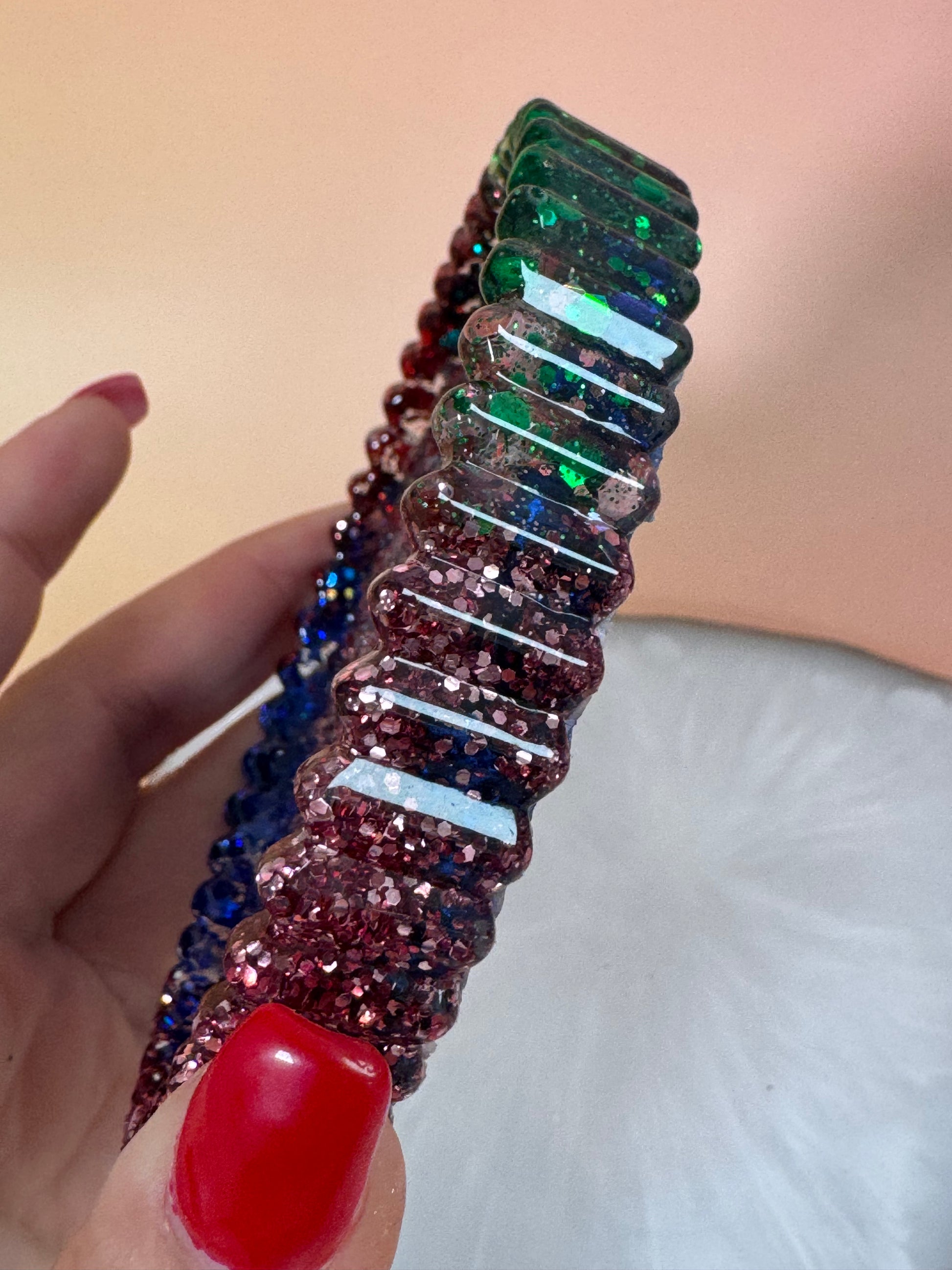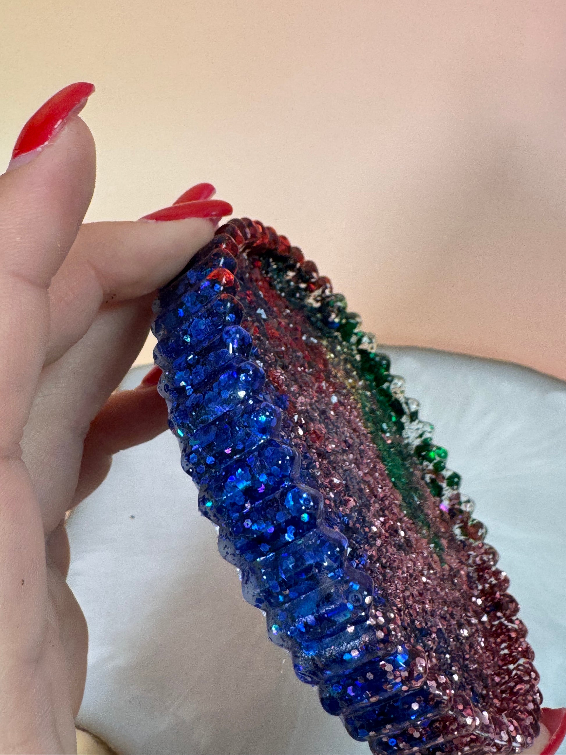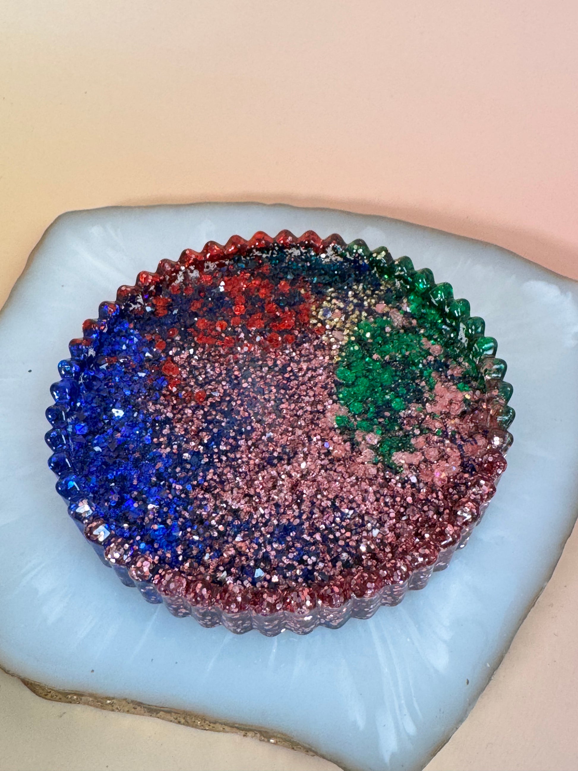 Das komplette Schälchen ist aus Epoxidharz. Darin sind viele verschiedene Glitzerflakes.