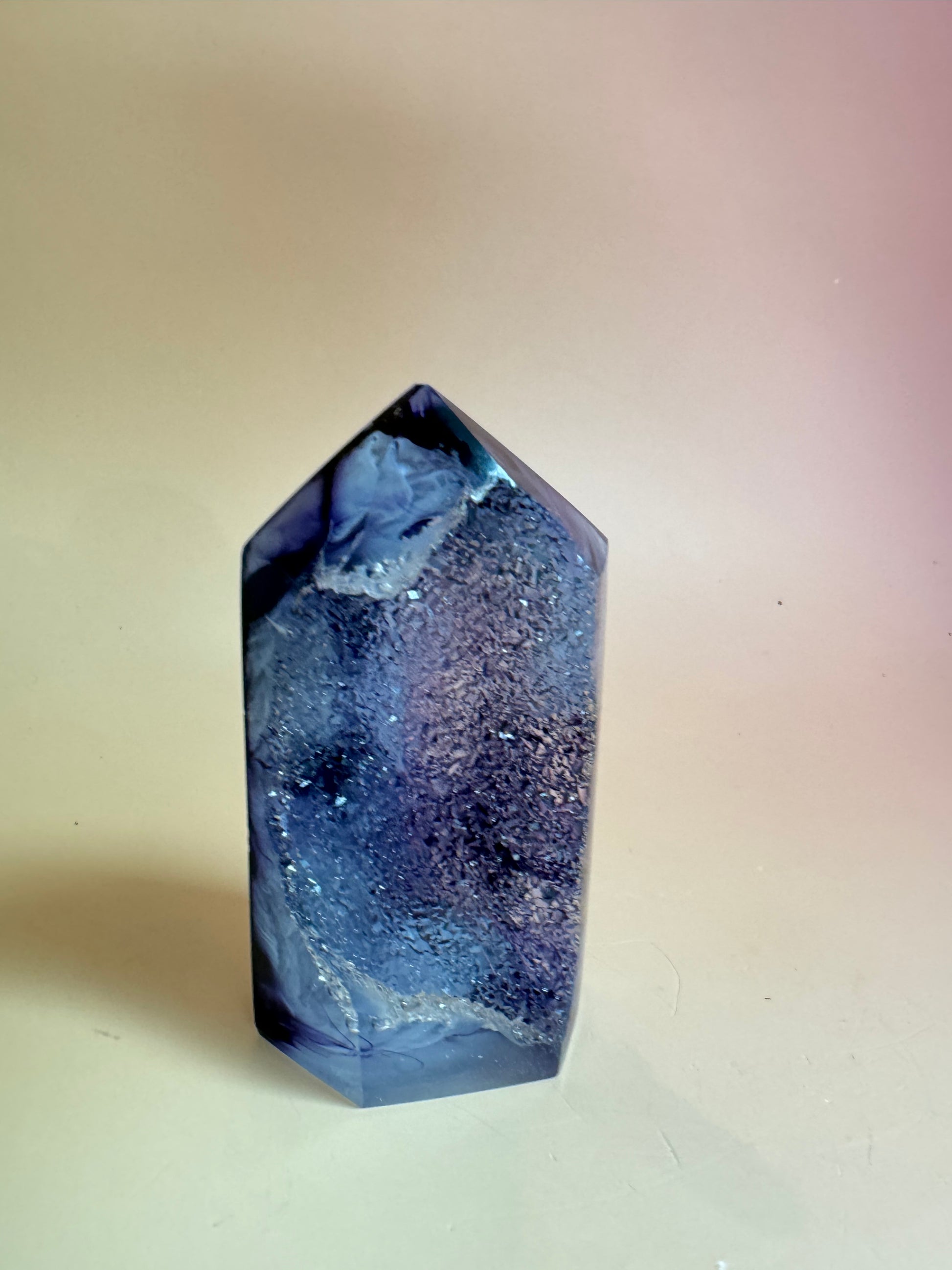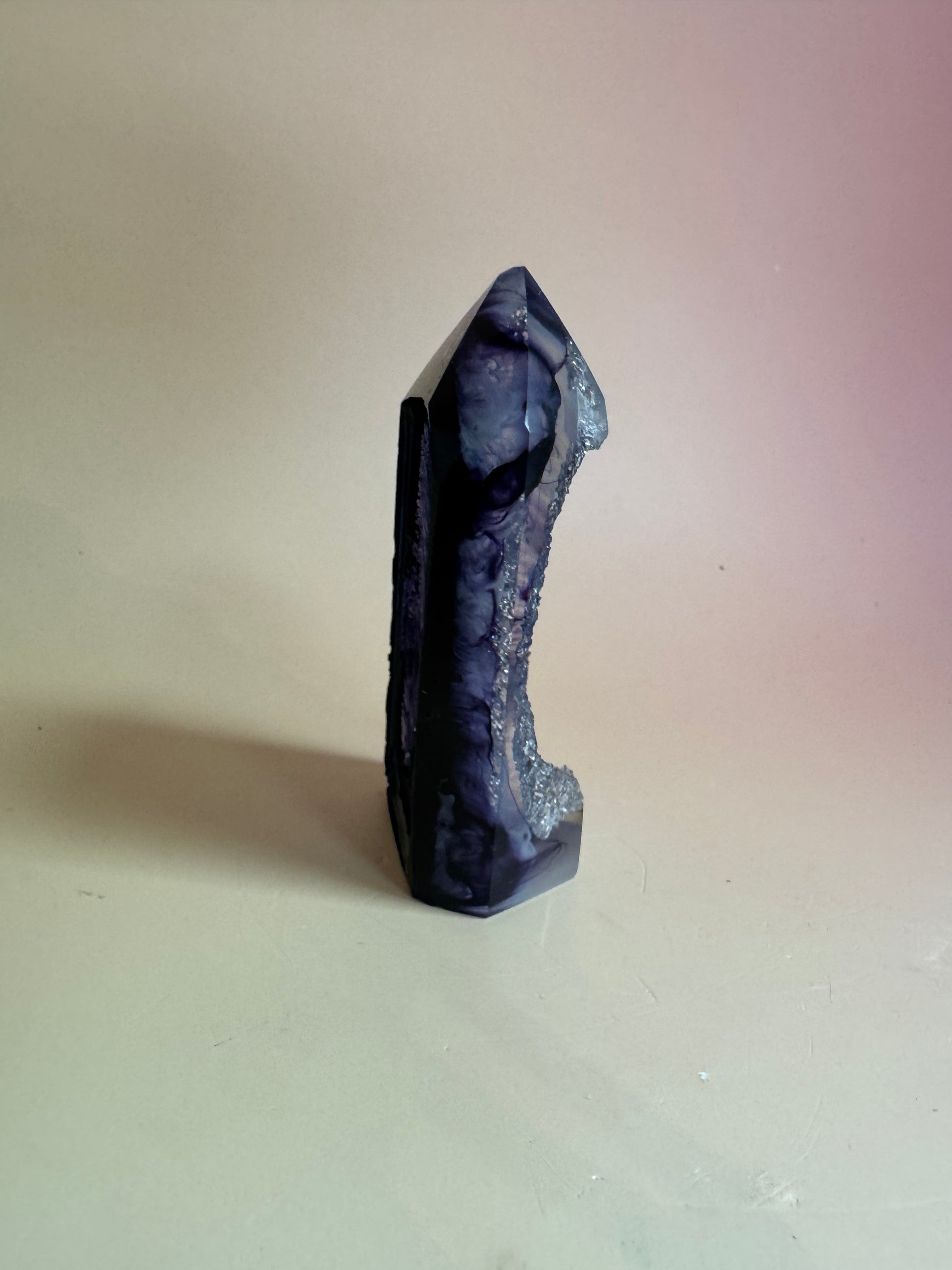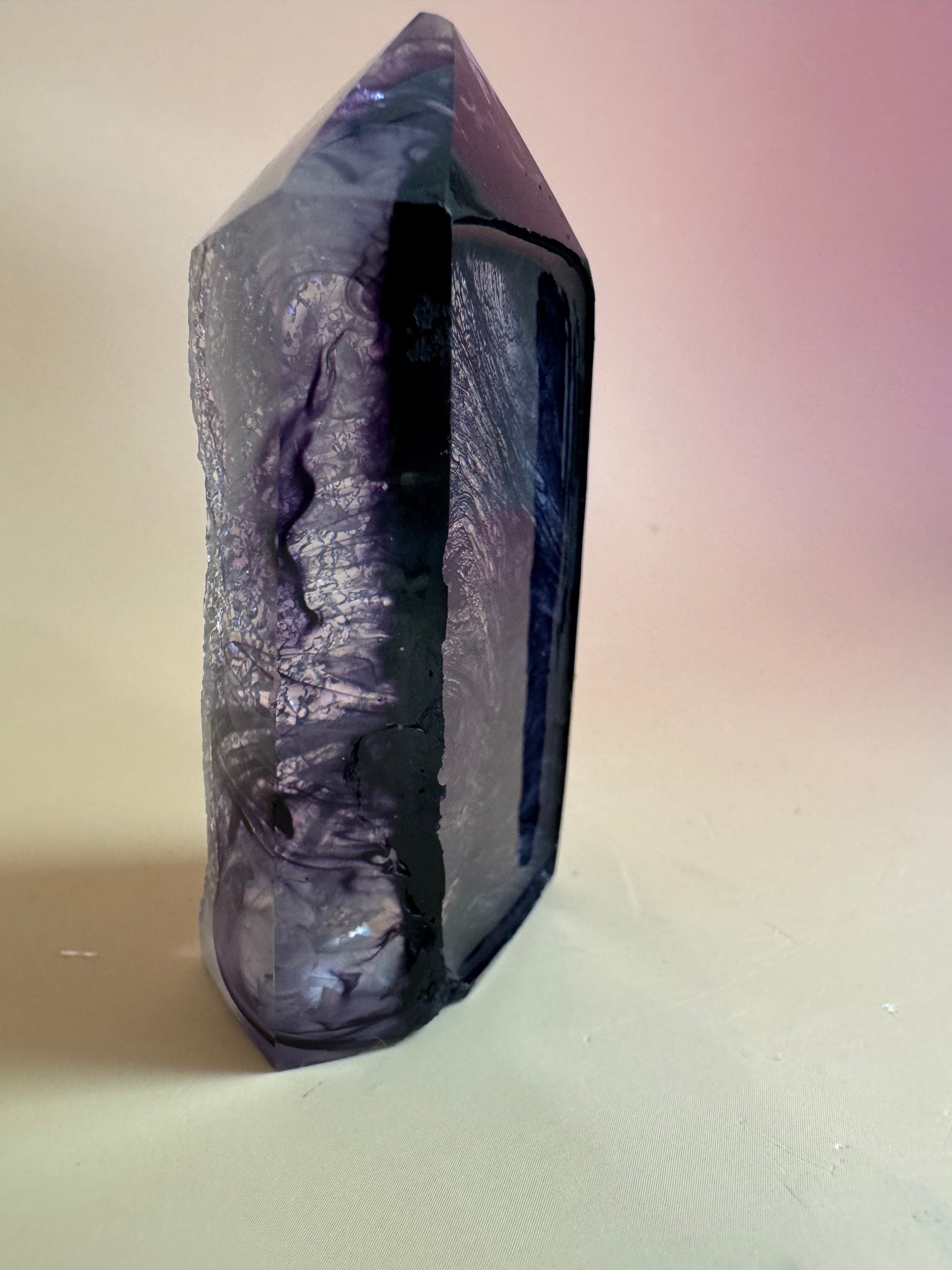 Er ist transparent und hat integrierte lila weiße Strukturen. Vorne hat er eine tolle Kristallstruktur.