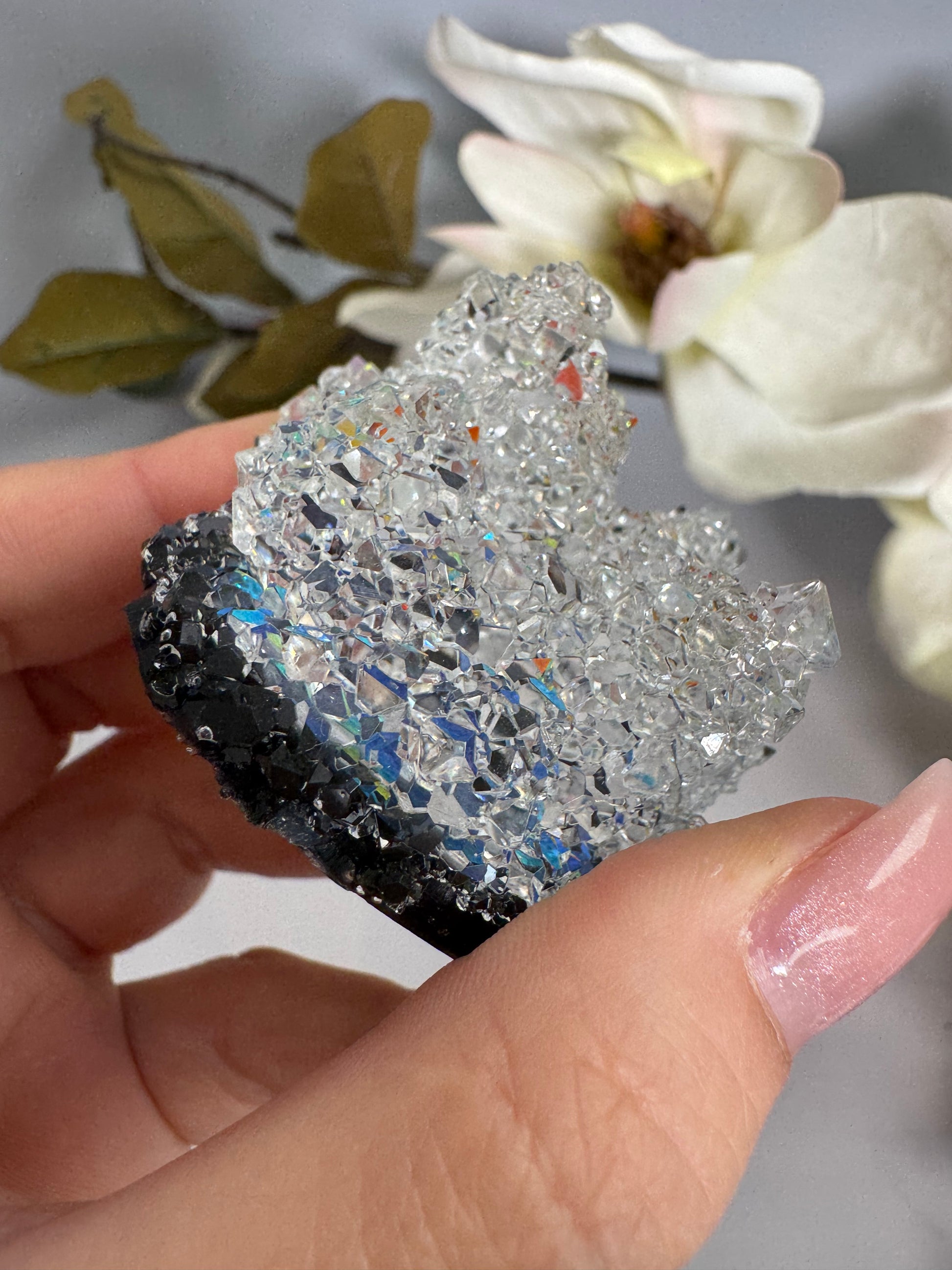 Er ist transparent und strahl je nach Neigung in Regenbogenfarben. Der Boden ist schwarz.