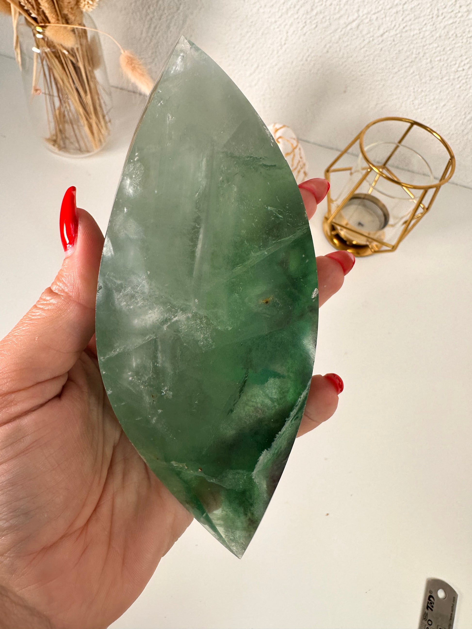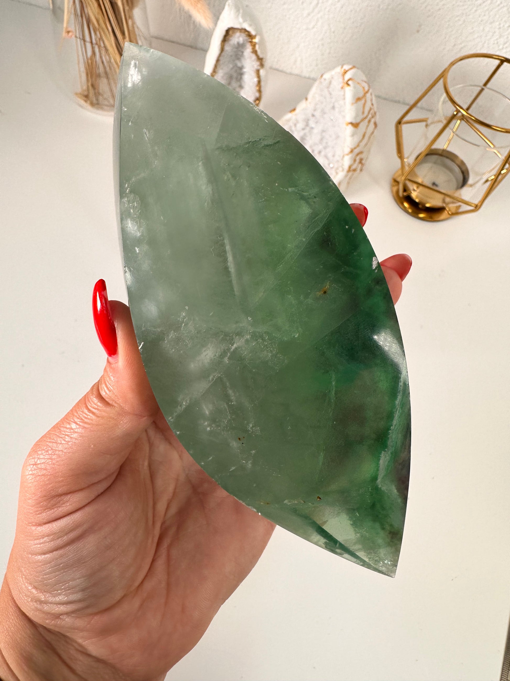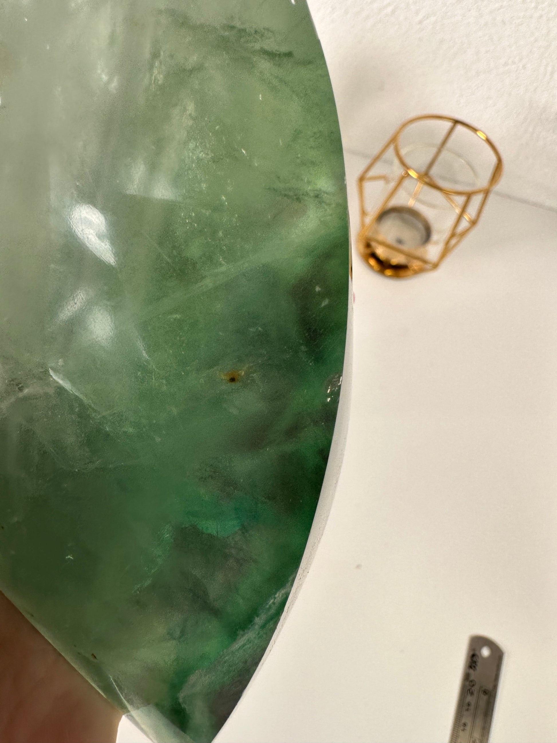 Bitte beachte dass Farbabplatzer am Metallständer zu sehen sein können. Geschliffener Fluorit ist sehr empfindlich, sodass Kratzer und kleine Macken an den Seiten vorhanden sein können. Bitte vorsichtig in das Metallgestell stellen.