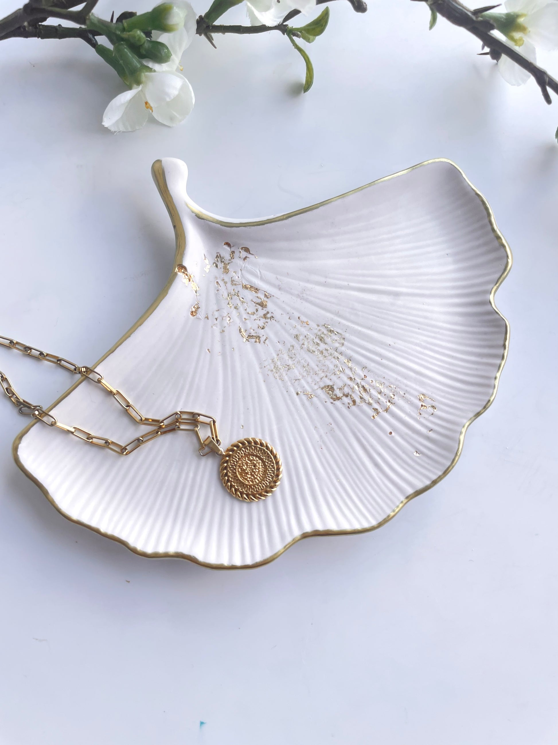 Die Farbe ist hell bis weiß, du kannst wählen ob du silberne, goldene oder kupferne Partikel im Schälchen haben möchtest. Der Rand wird passend zur Partikel Farbe bemalt.