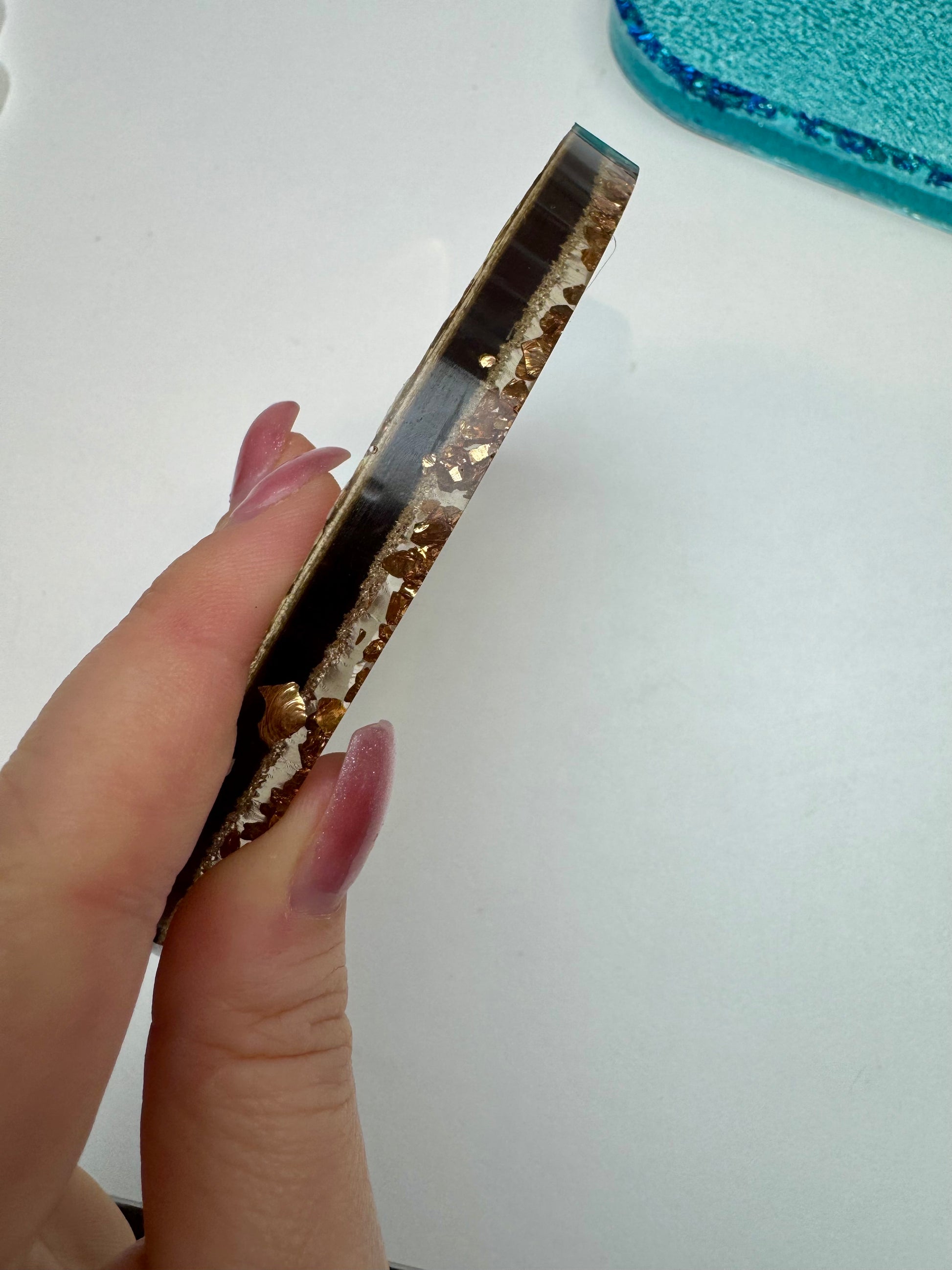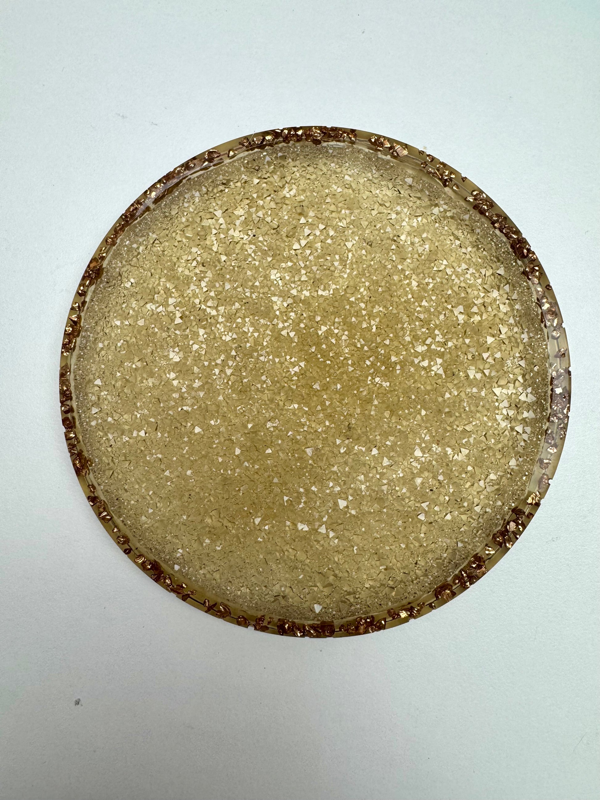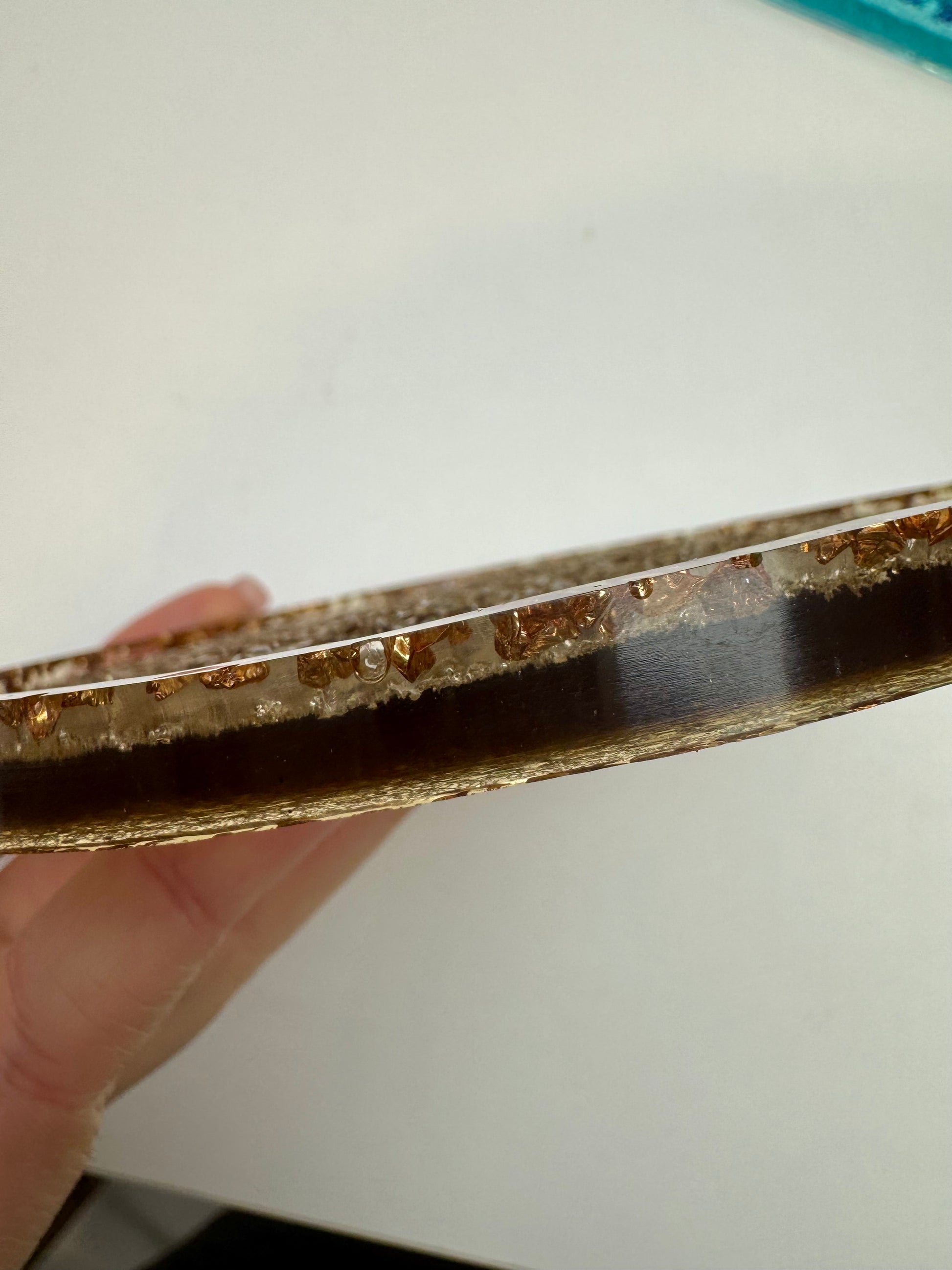 Das komplette Schälchen ist aus Epoxidharz. Die Farbe der Schale ist ein helles baun, am Rand sitzen Steinchen in der Farbe braun.