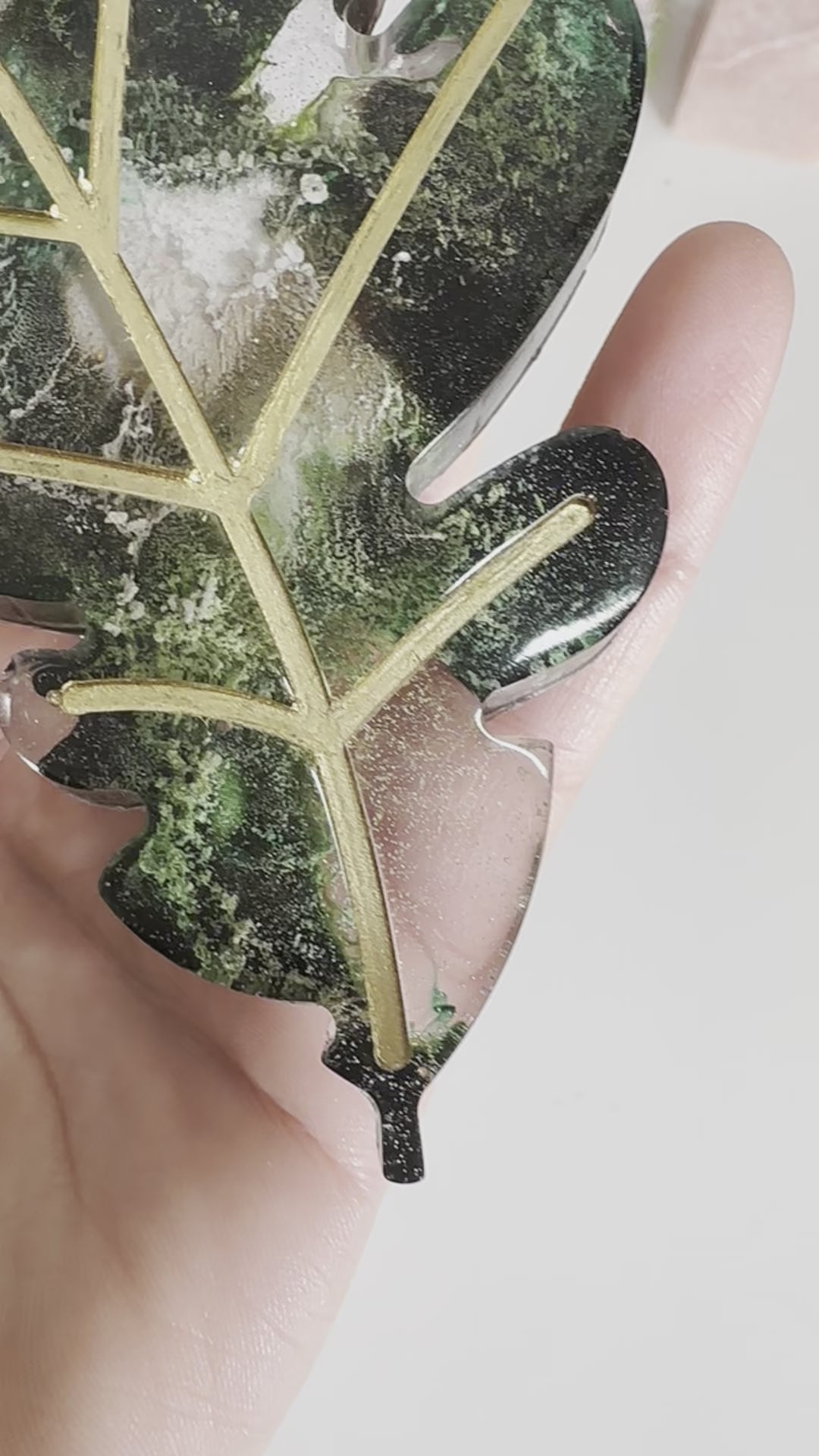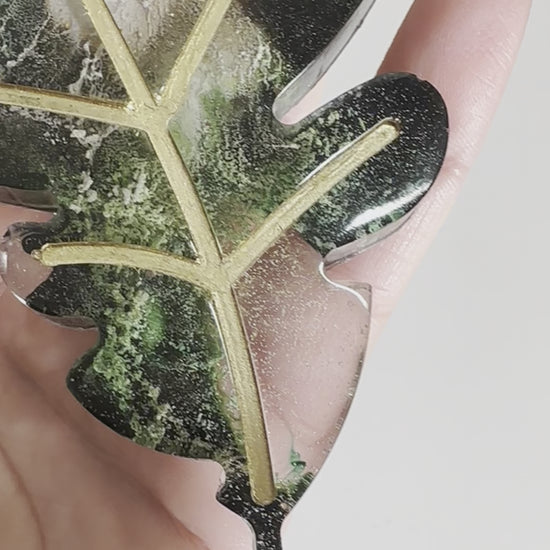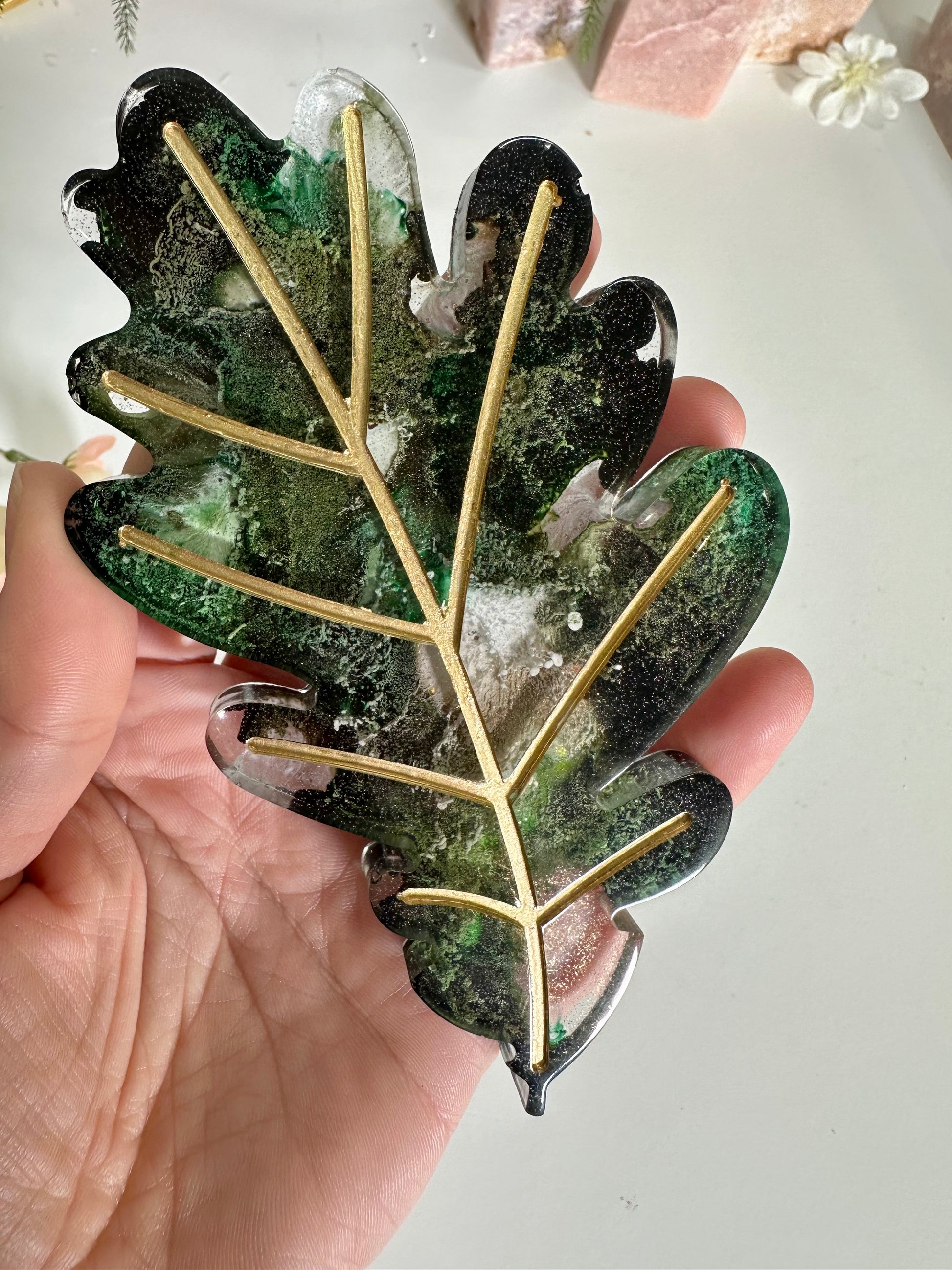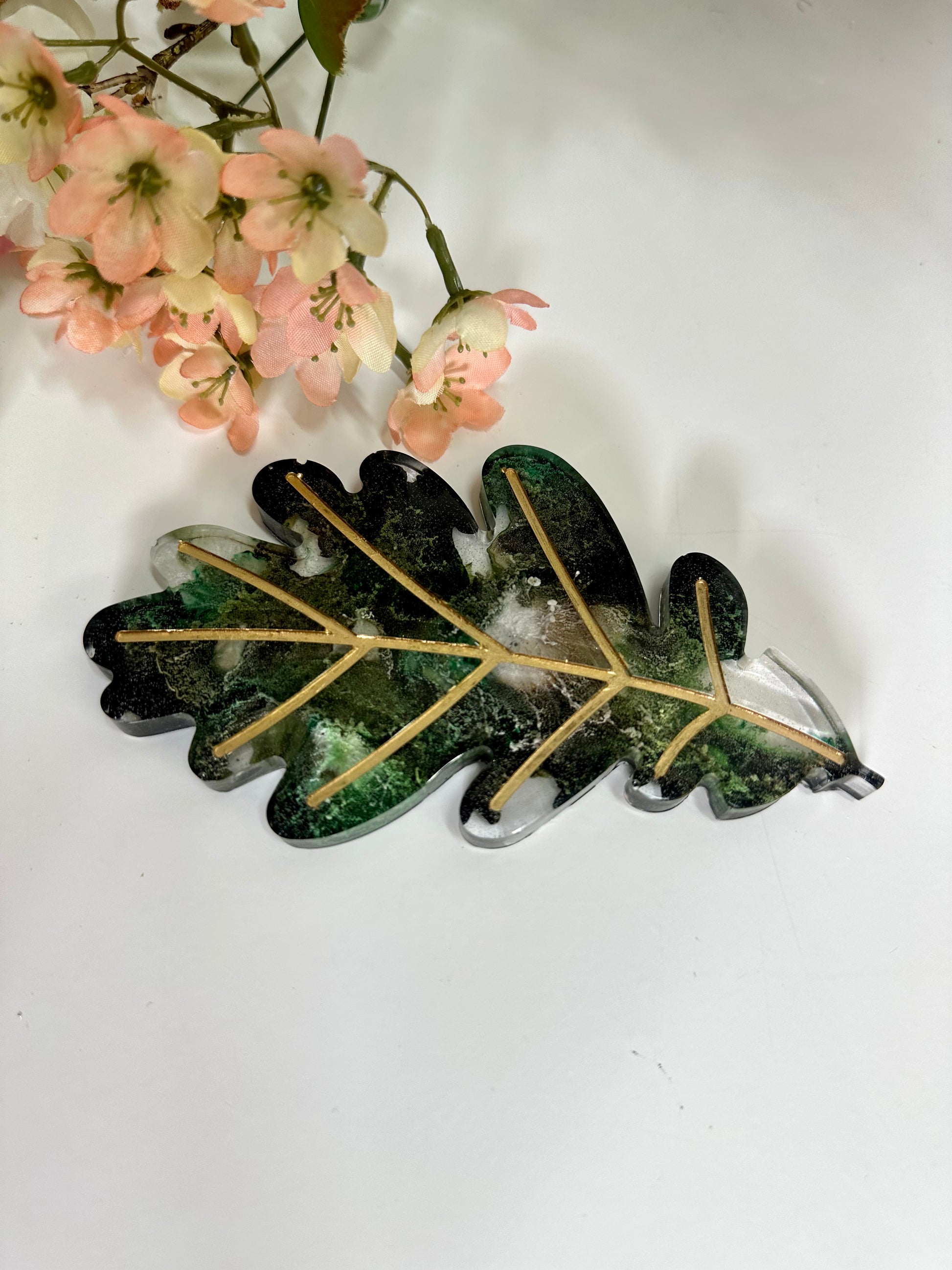 Diese süsse kleine Ablage ist aus Epoxidharz. Das Muster des Blatt ist abgesetzt und goldfarben. Die Farben in der Ablage sind grün, weiß und gold.