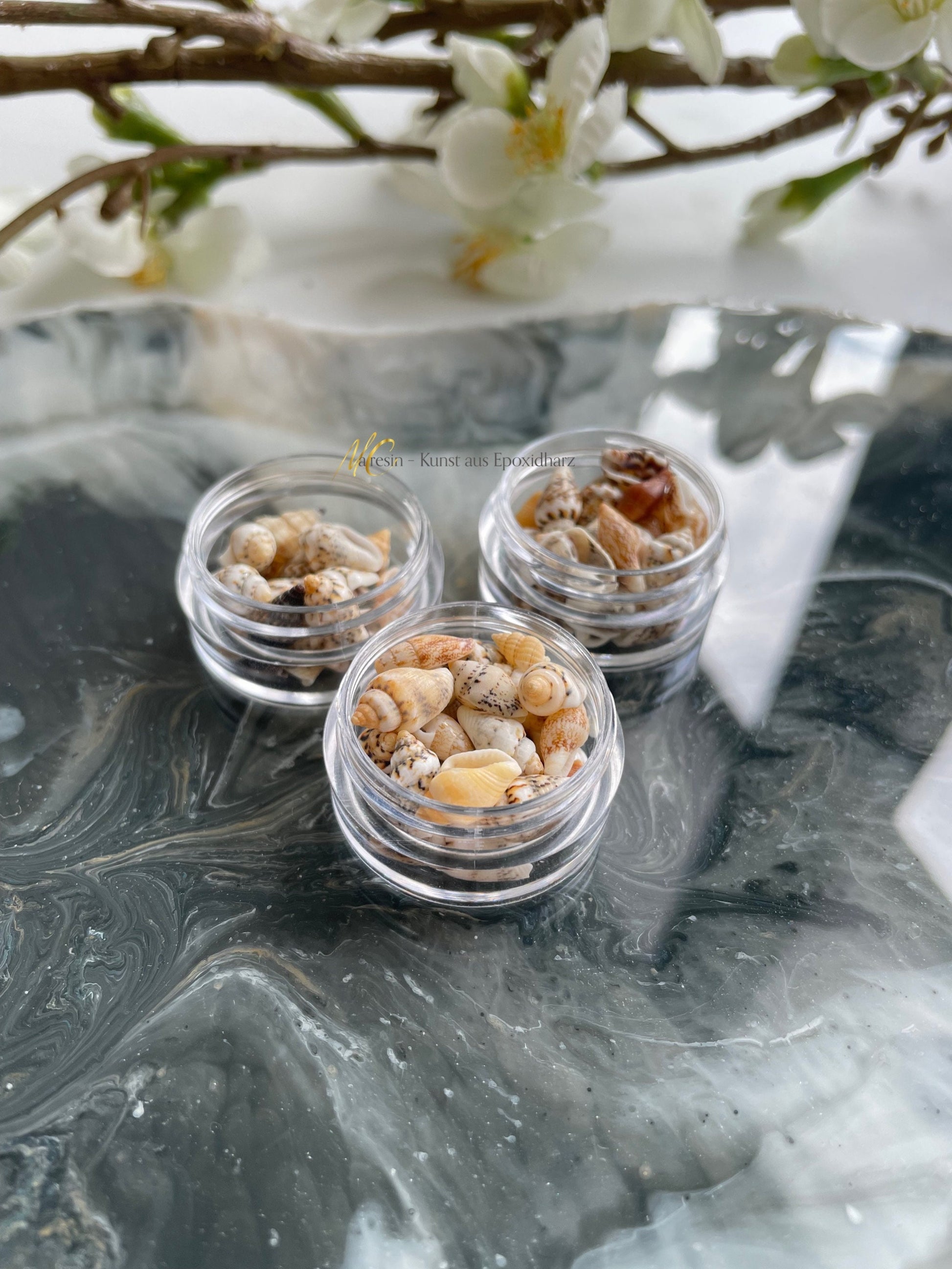Kleine Muscheln, zum Einarbeiten in Epoxidharz geeignet.