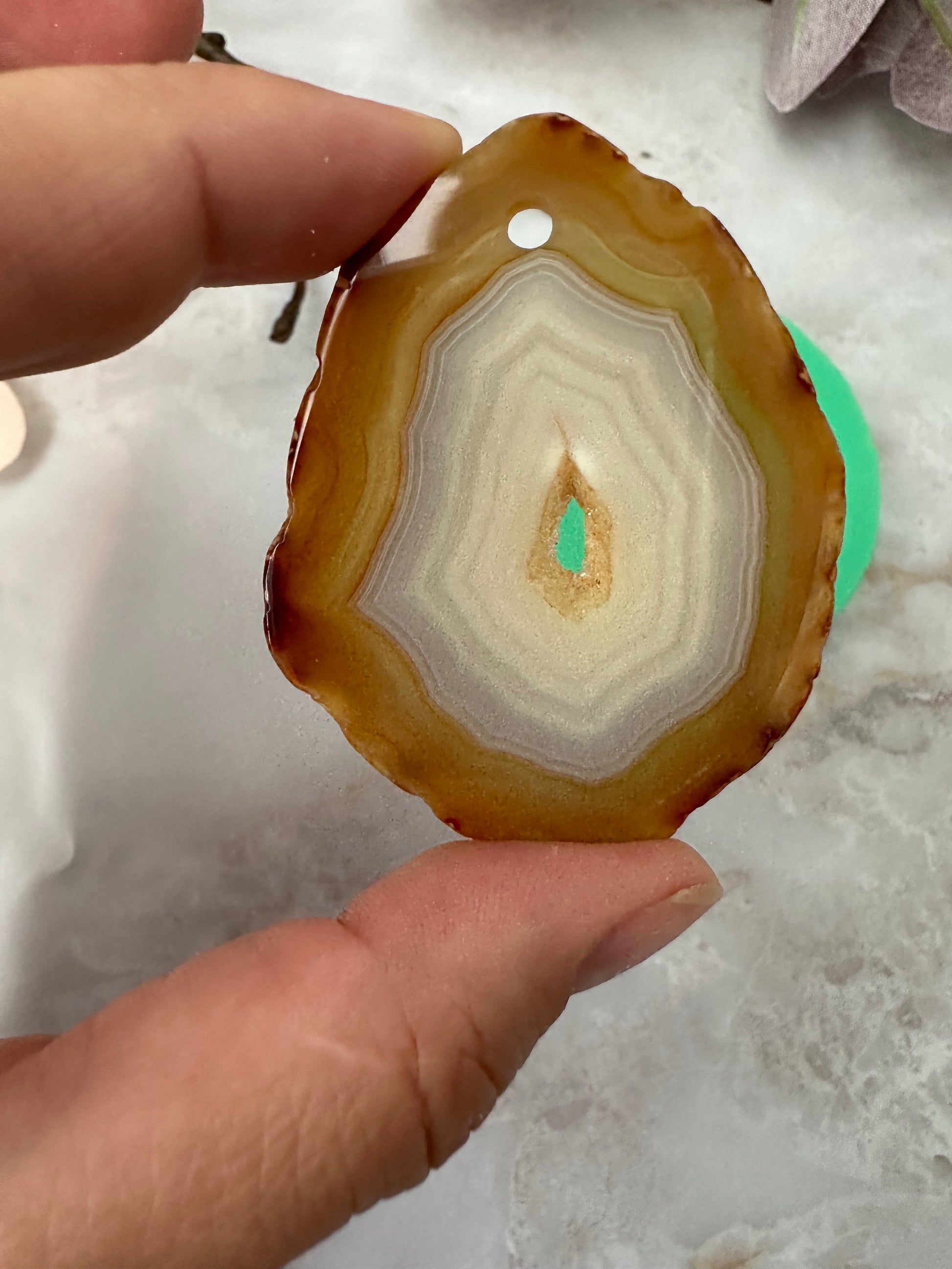 Die Form wird von einer natürlichen Achatscheibe abgeformt, sodass die Form immer kleine Unebenheiten hat, so wie die Stein selbst. Die Achatscheibe hat oben ein Loch, sodass sie perfekt als Anhänger geeignet ist. In der Mitte hat sie ein Glitzer Drusen Loch.