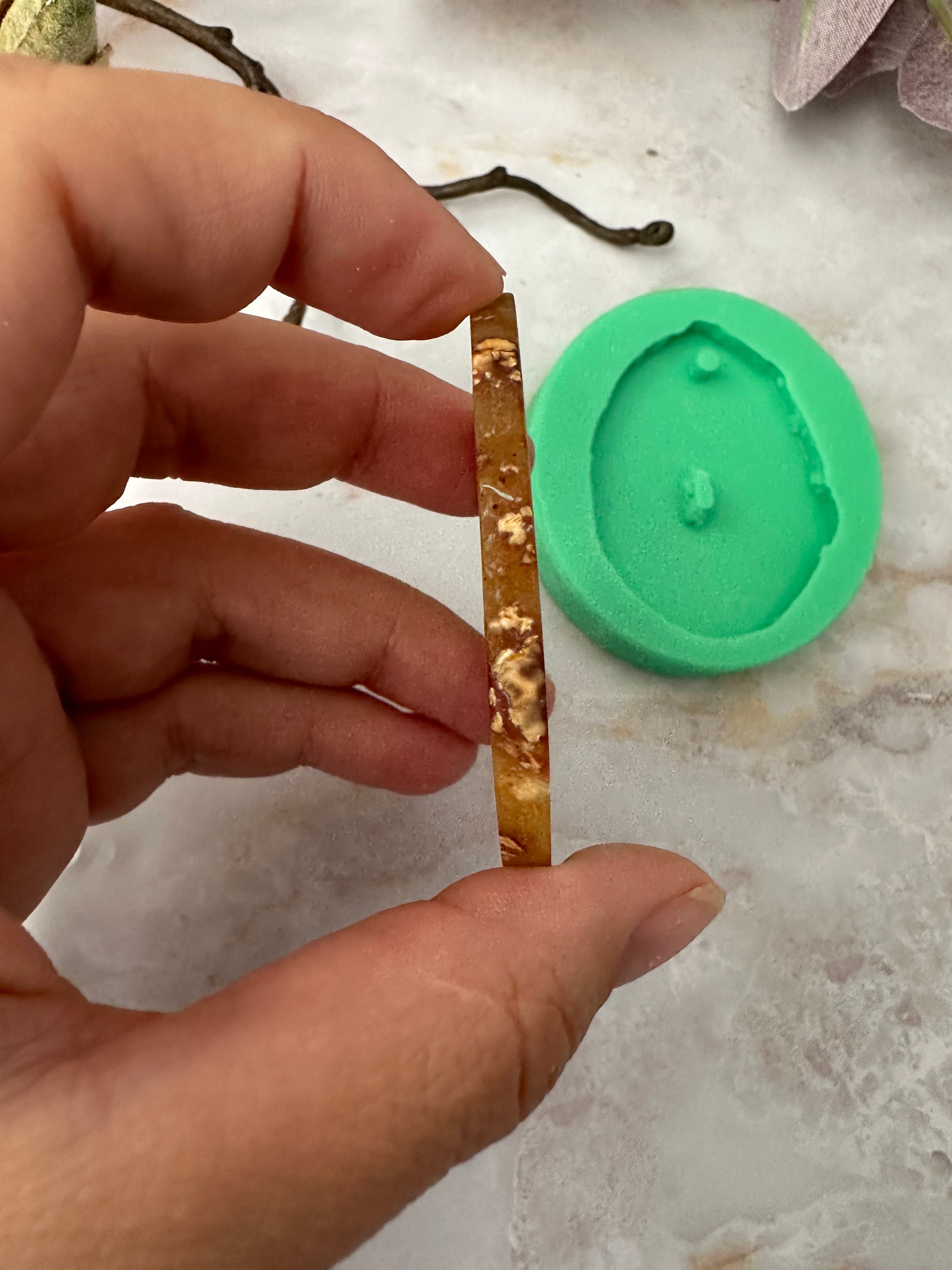 Das Druzy Element in der Mitte kann beim Entformen schnell reißen. Es ist deshalb wichtig dass man zuerst vorsichtig die Mitte des Steins löst, bevor man den restlichen Stein entformt.