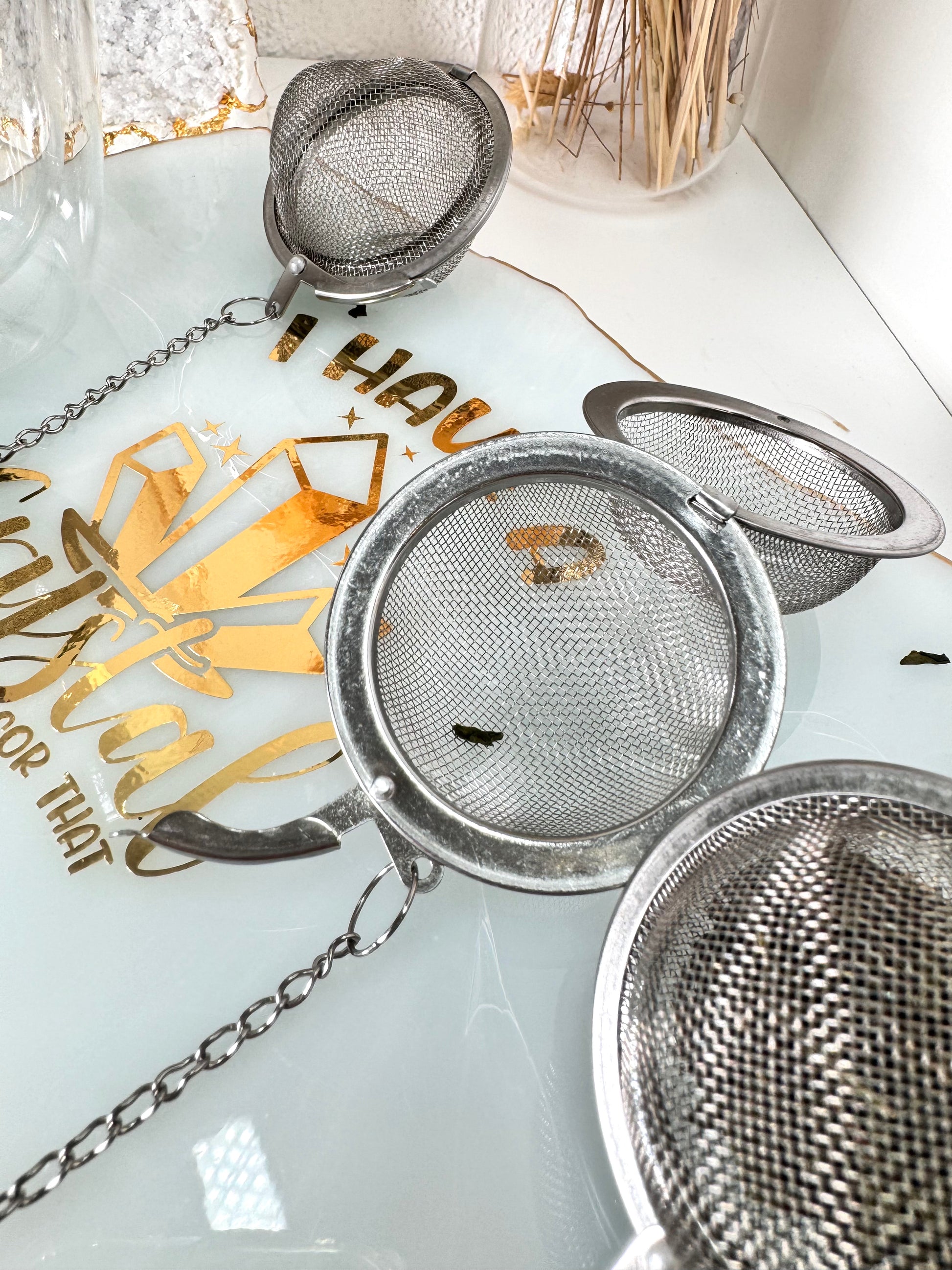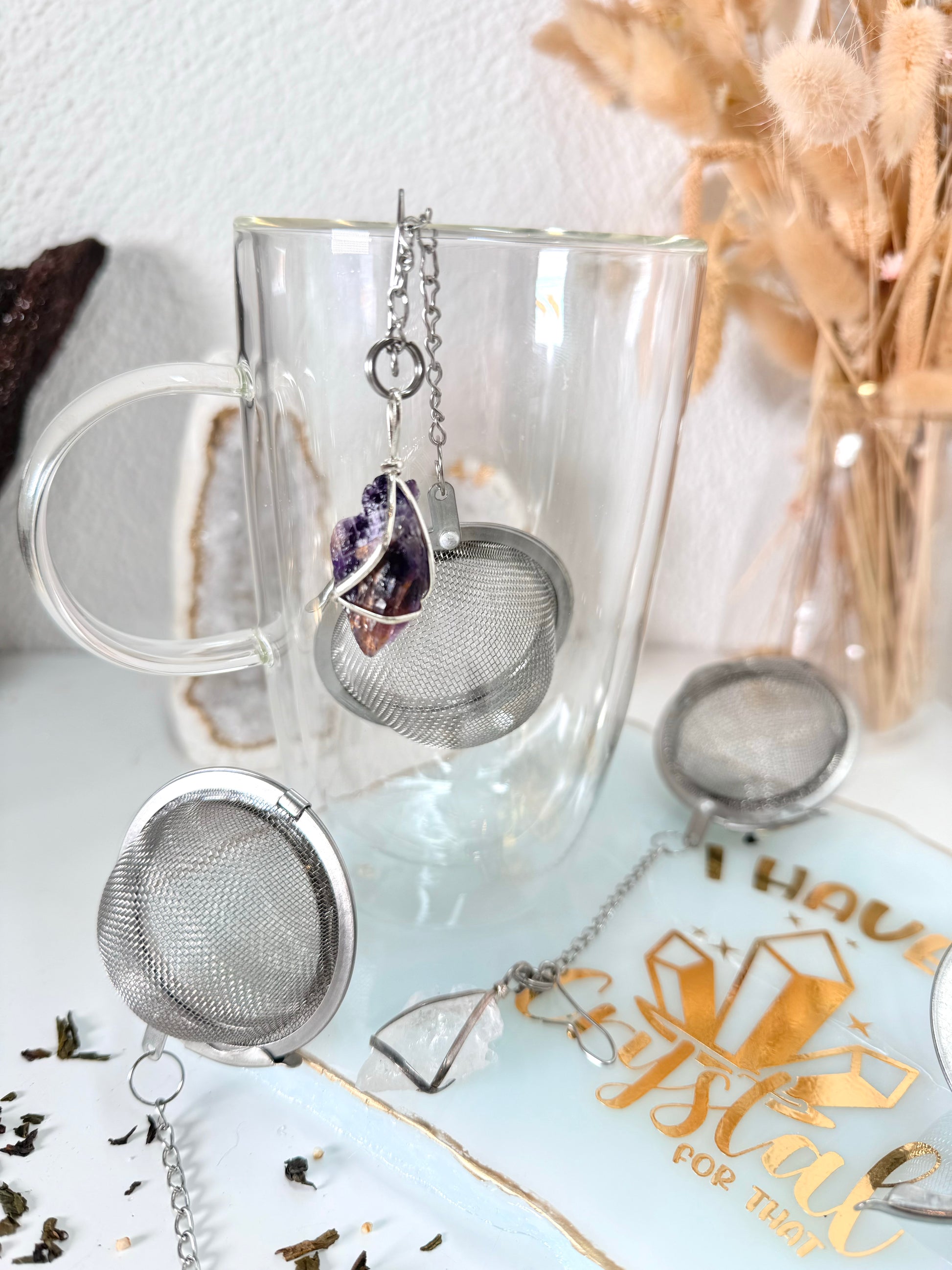 Das Teesieb ist aus Edelstahl mit einem Gesamtdurchmesser von 55mm. An Ende ist an einer Kette eine Amethyst oder Bergkristall Spitze angebracht. Der kleine Haken kannst du an den Rand der Tasse machen, damit hält das Sieb besser und fällt nicht in die Tasse