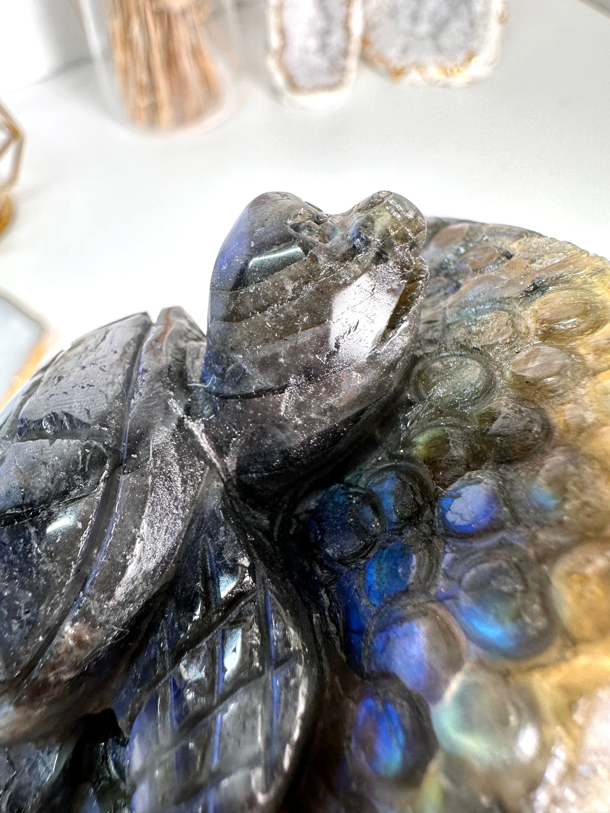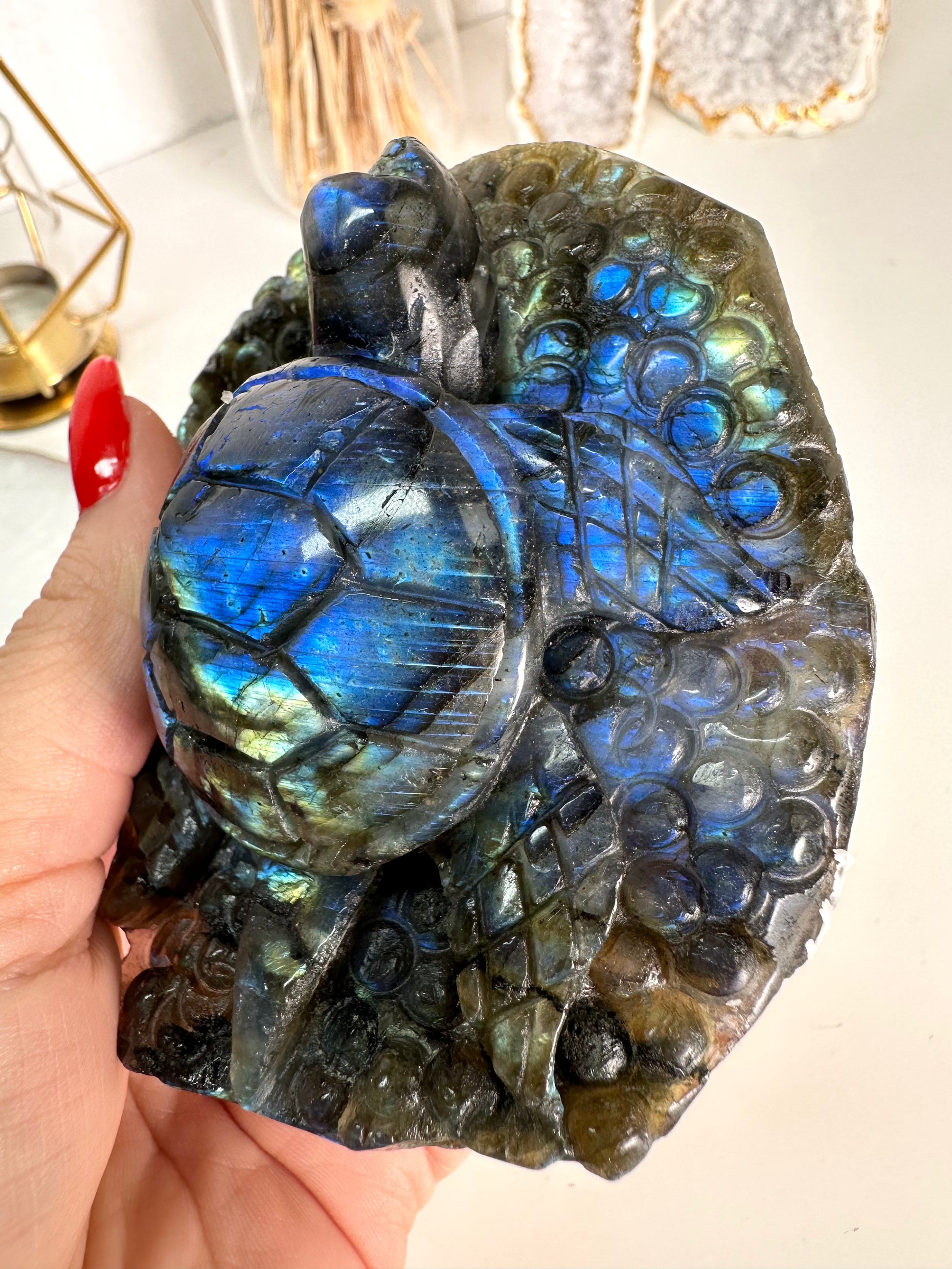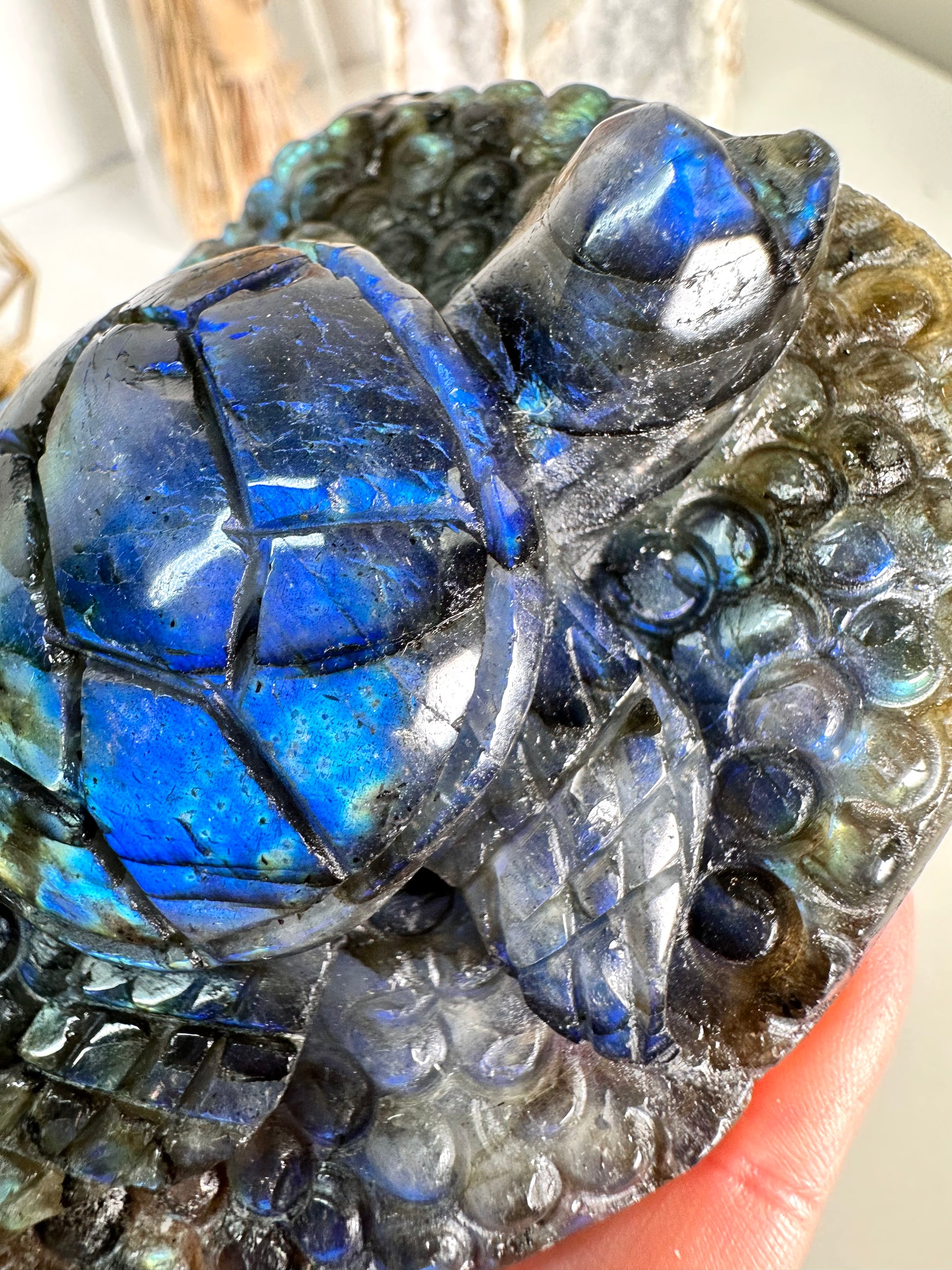 Unglaublich schönes Carving, bei dem die Details per Hand eingraviert wurden. Die Schildkröte sitzt auf einer Art Stein. Sie hat starke blaue Flashs