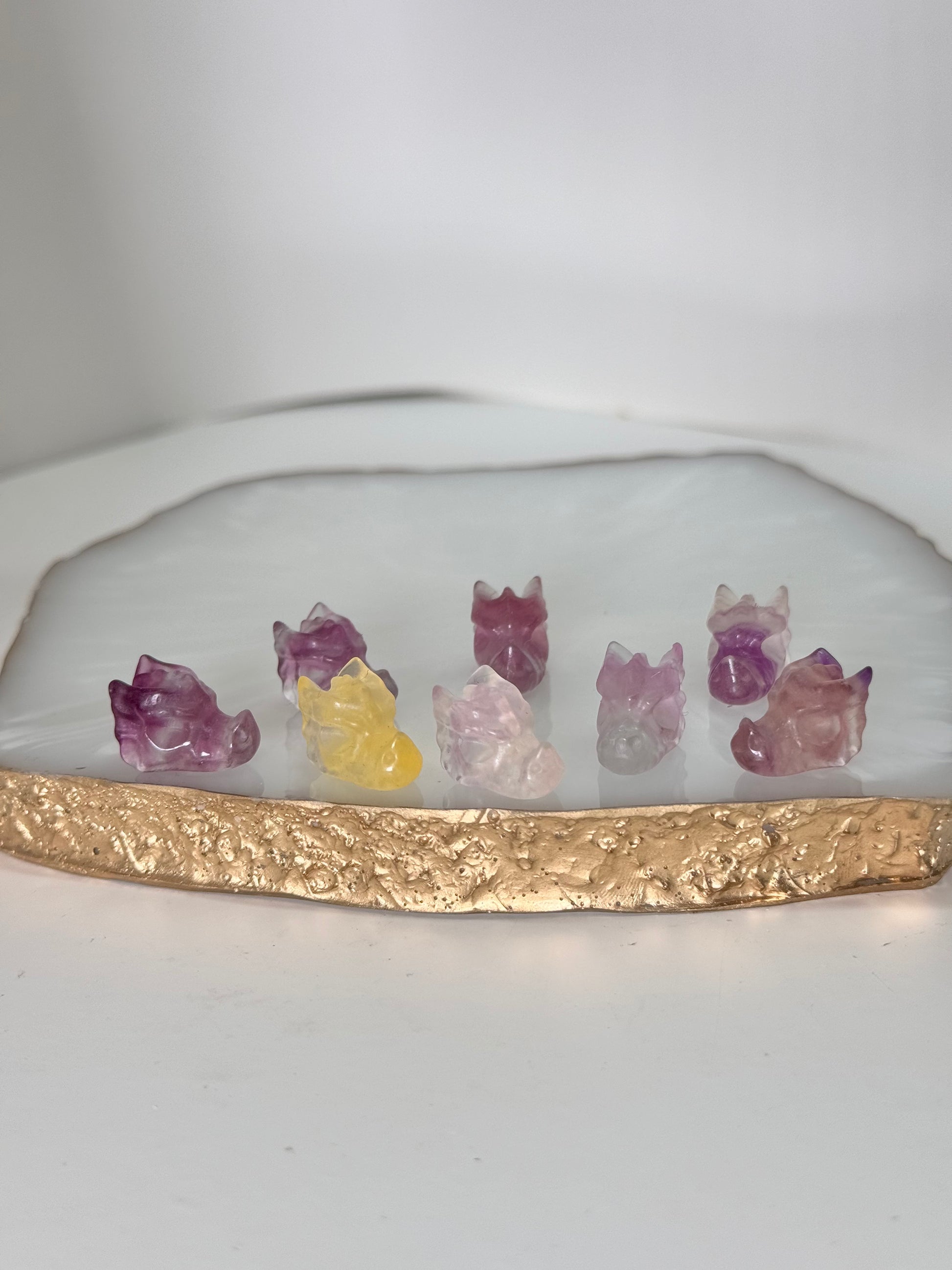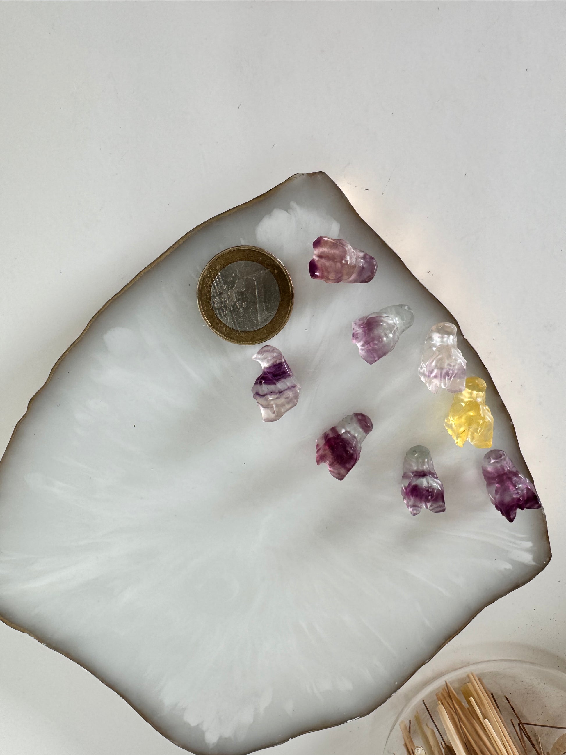 Die Auswahl des Carvings erfolgt intuitiv und per Zufall, Farbwünsche können leider nicht berücksichtigt werden. Das Foto dient nur als Beispiel, jeder Fluorit ist anders gefärbt.