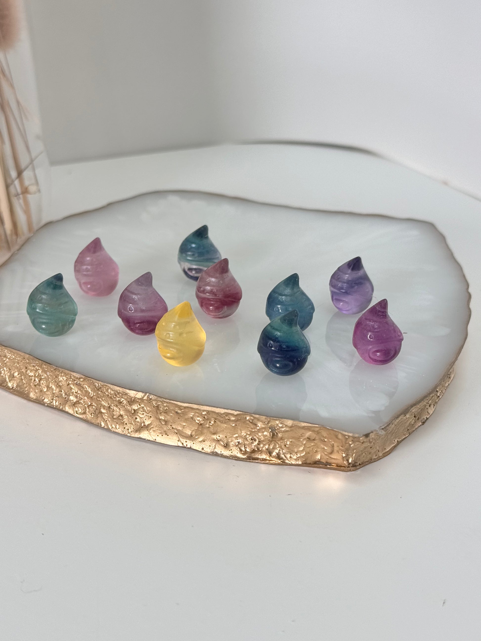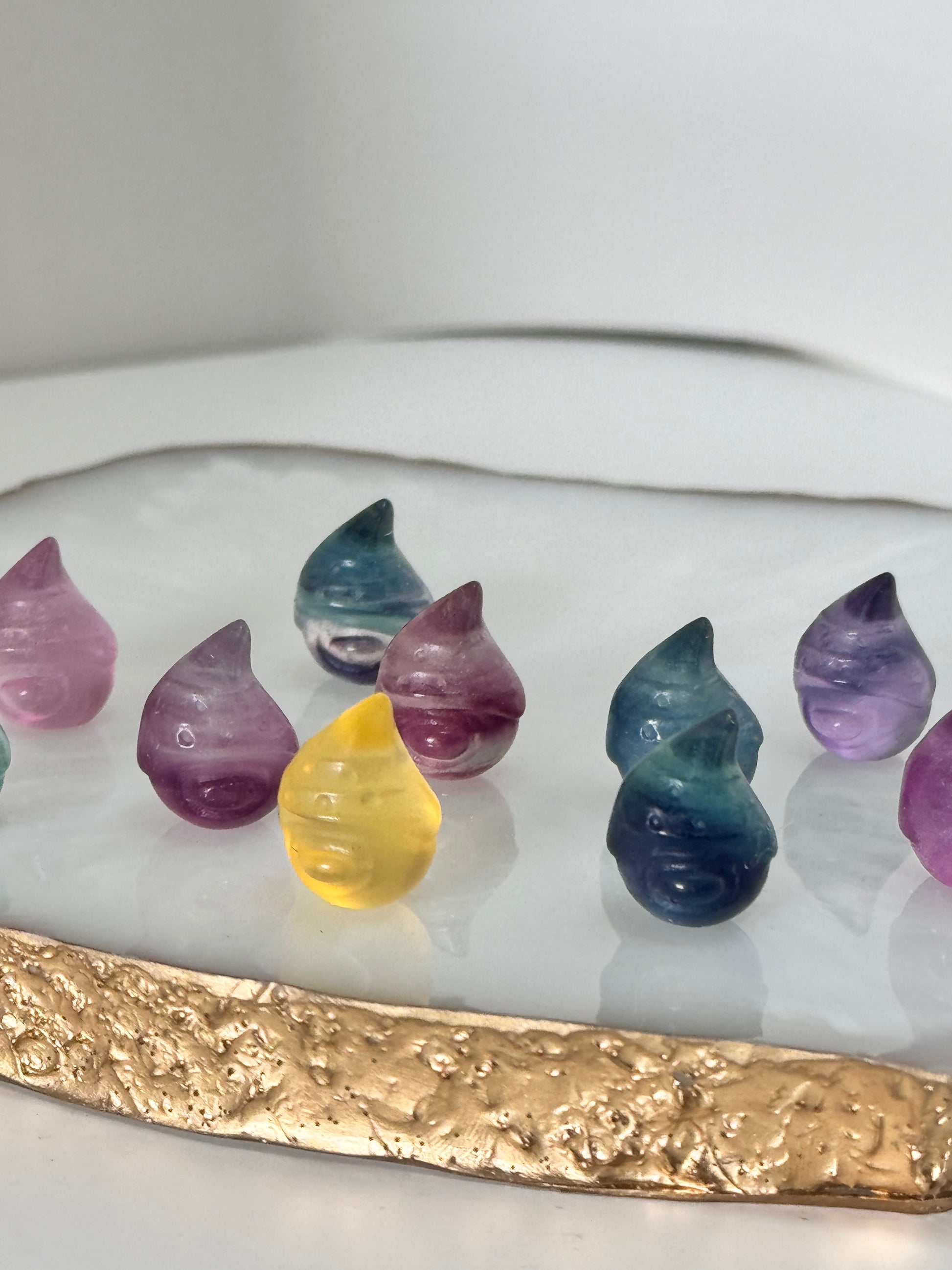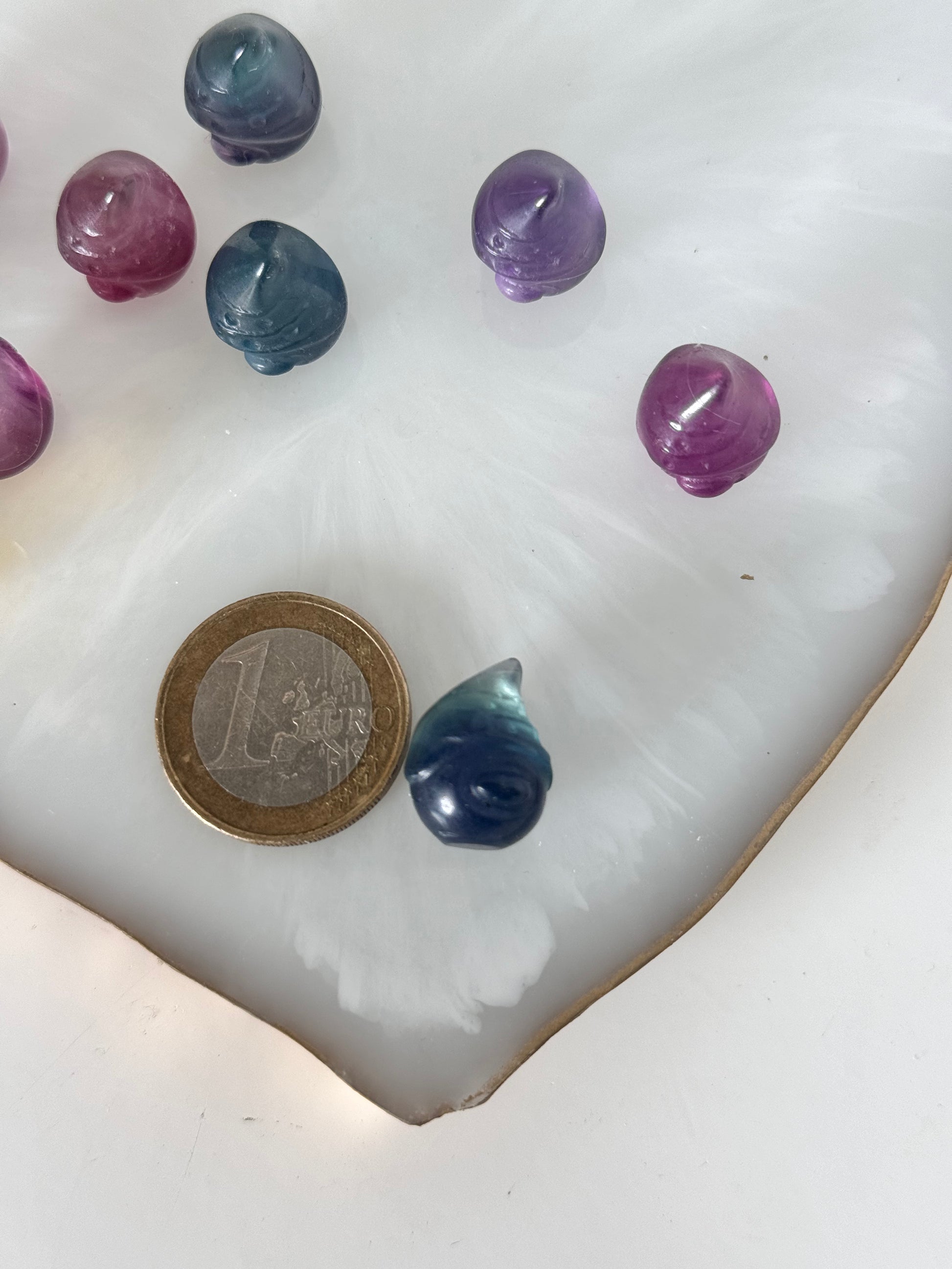 Die Auswahl des Carvings erfolgt intuitiv und per Zufall, Farbwünsche können leider nicht berücksichtigt werden. Das Foto dient nur als Beispiel, jeder Fluorit ist anders gefärbt.