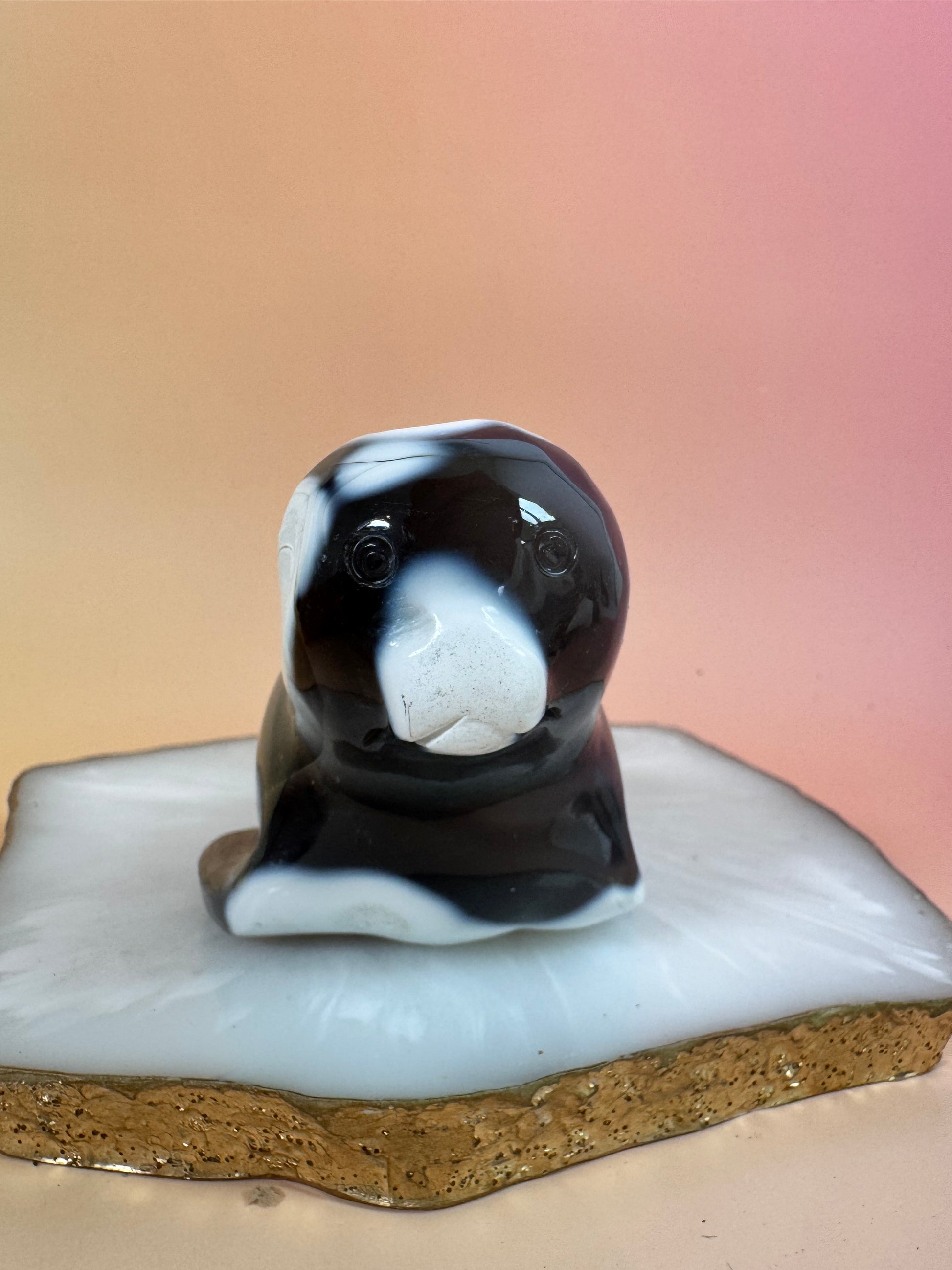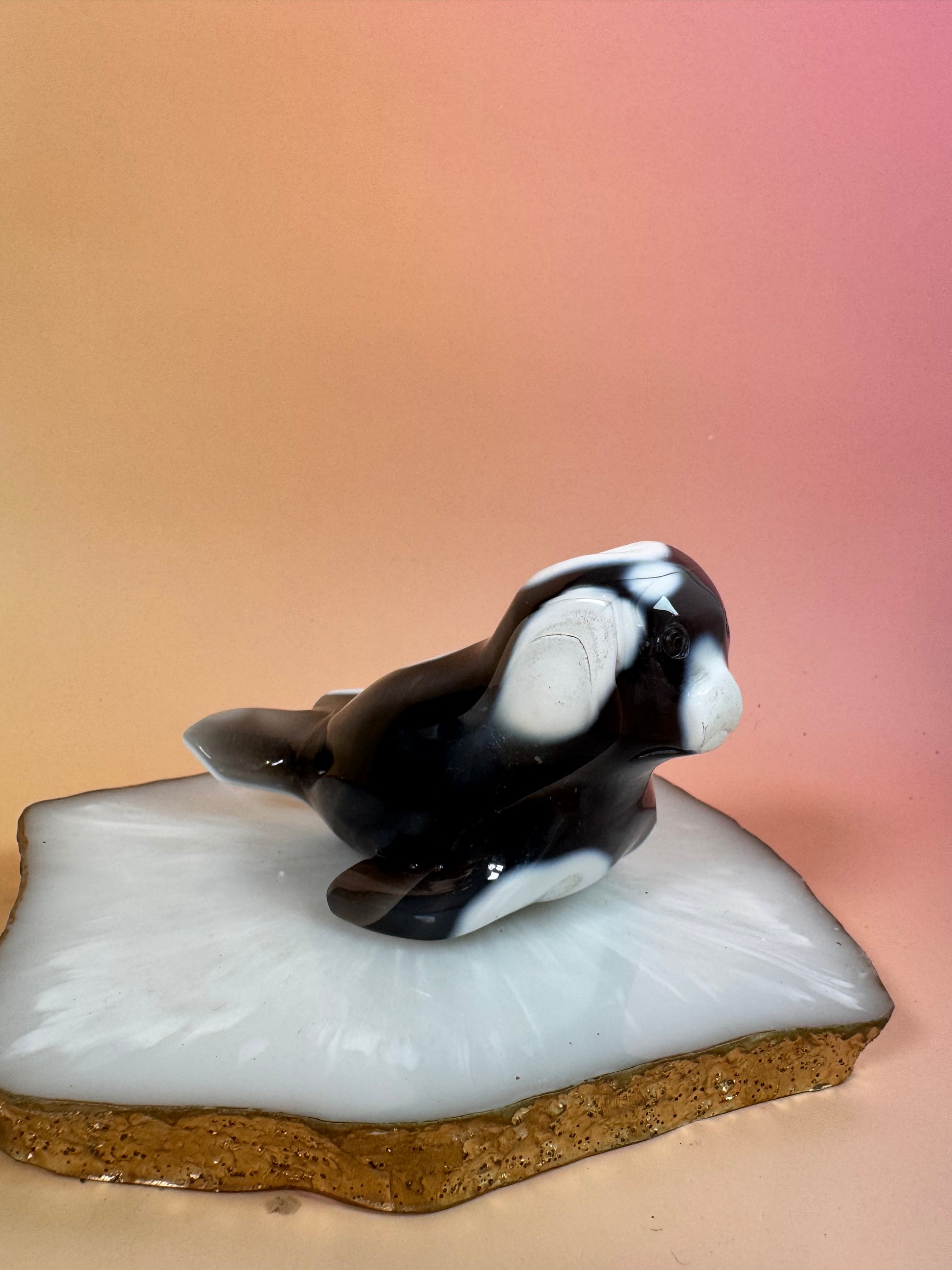 Er zeigt die typischen Orca Achat Strukturen, dazu zählen auch die weißen matten Stellen mit Rissen.