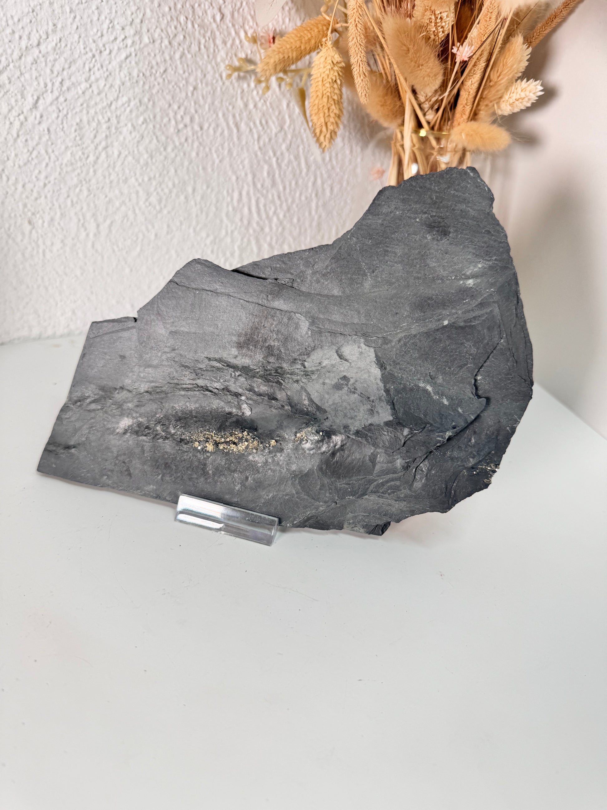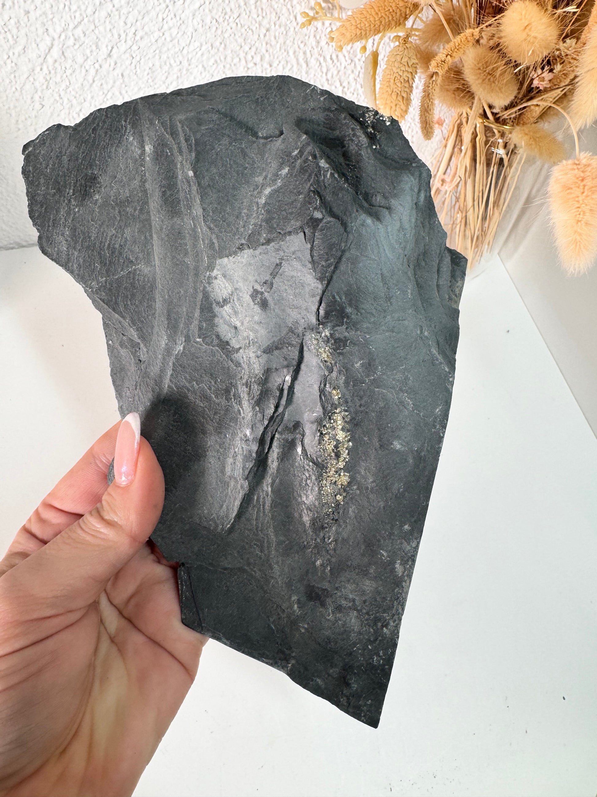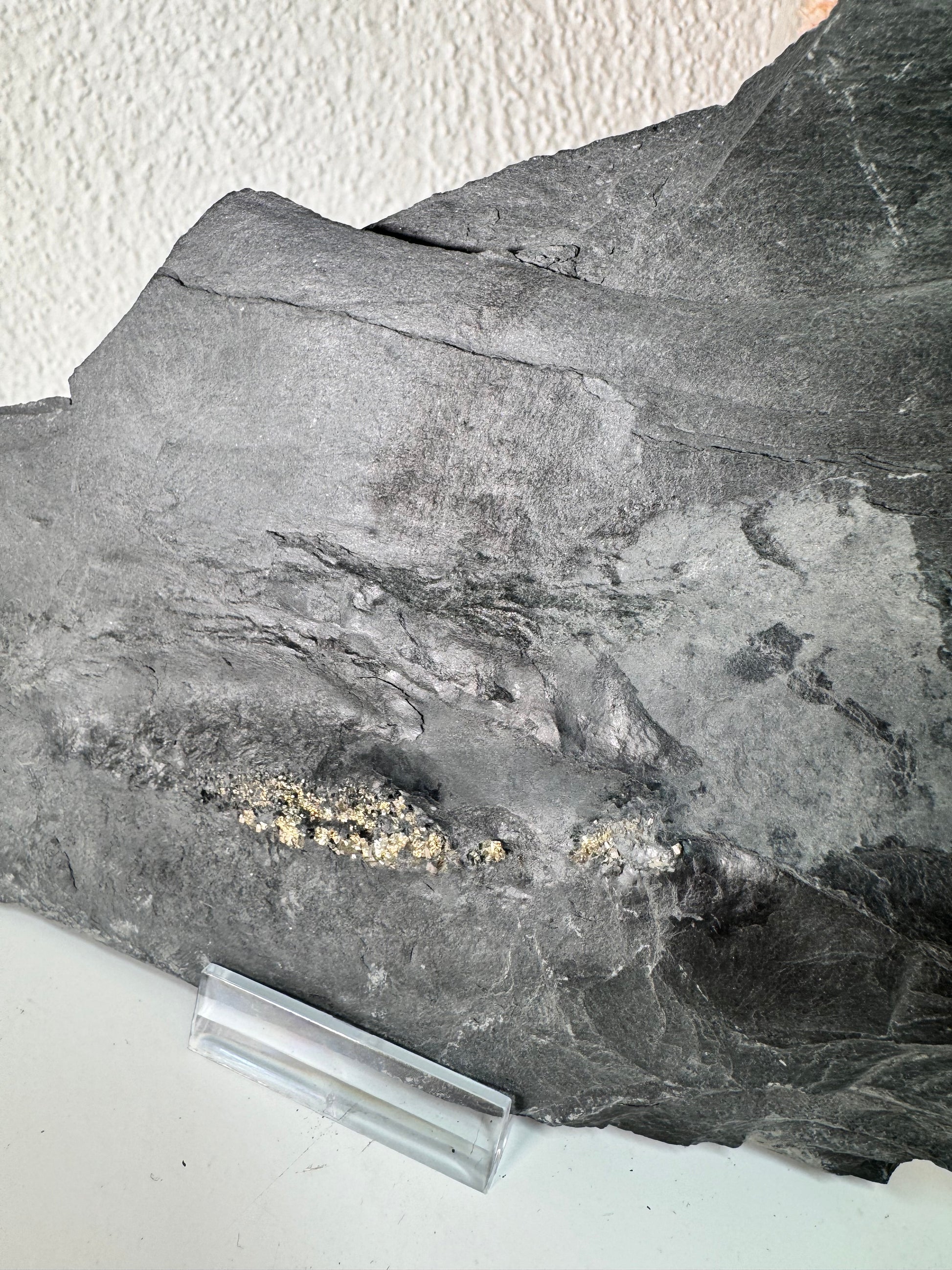 Diese große Schiefernplatte kommt aus Brasilien. Auf ihr sind kleine Pyrite gewachsen.