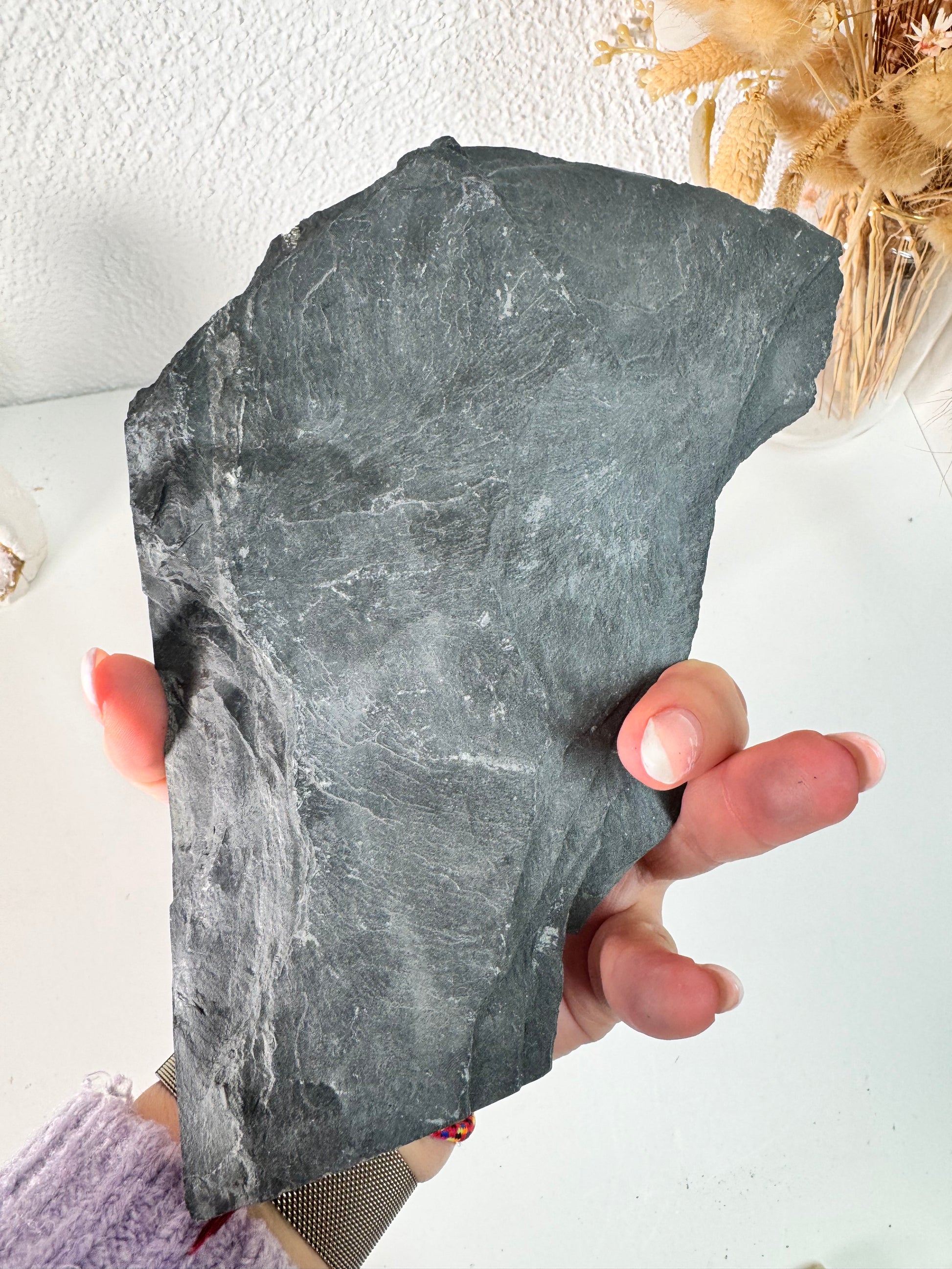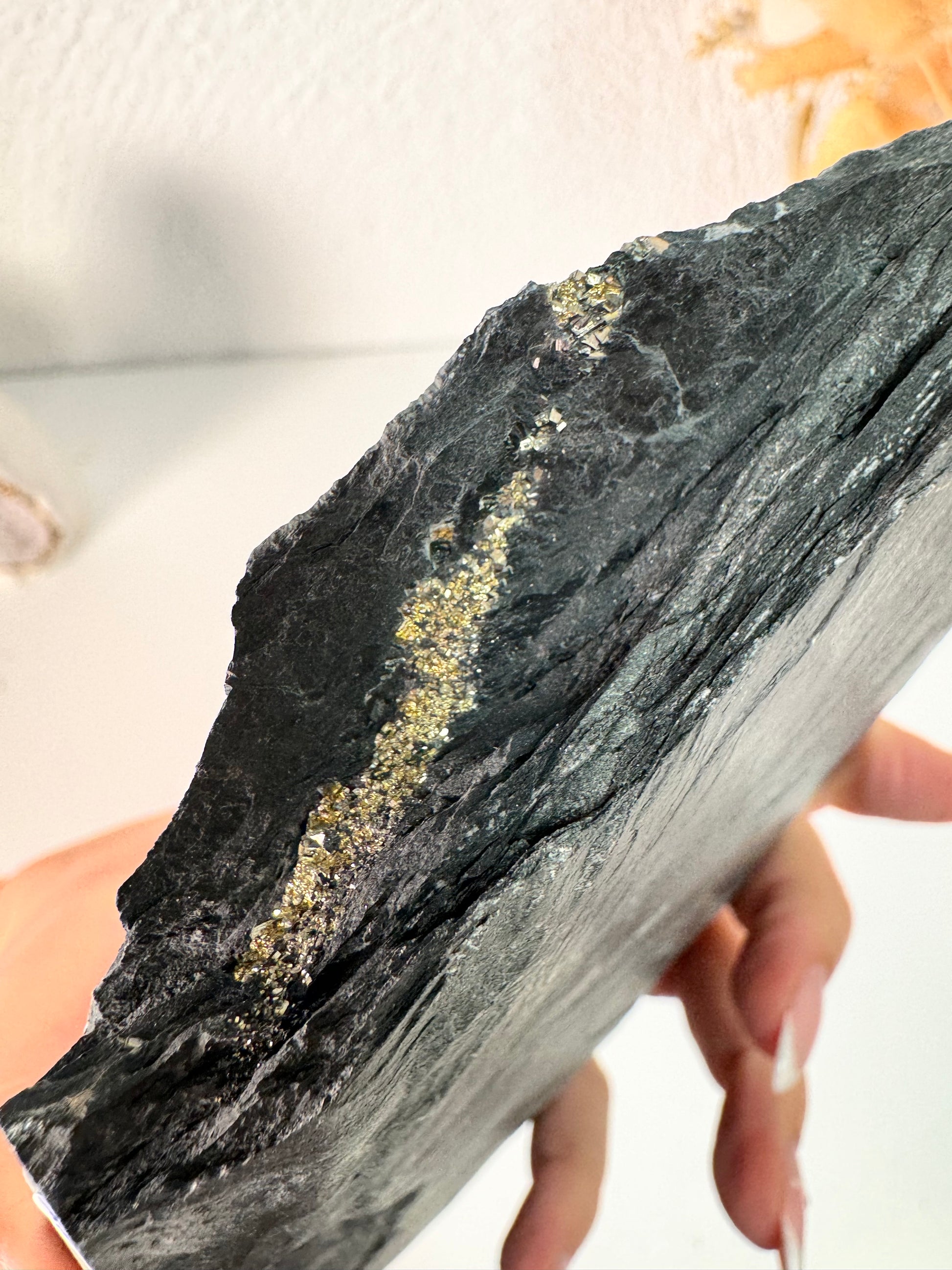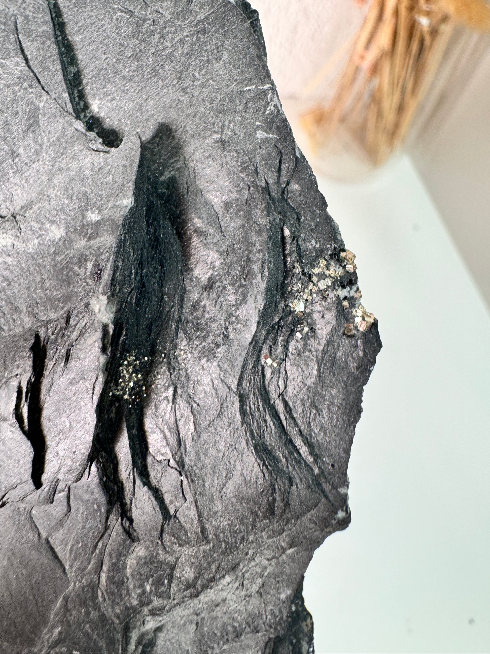 Diese große Schiefernplatte kommt aus Brasilien. Auf ihr sind kleine Pyrite gewachsen.