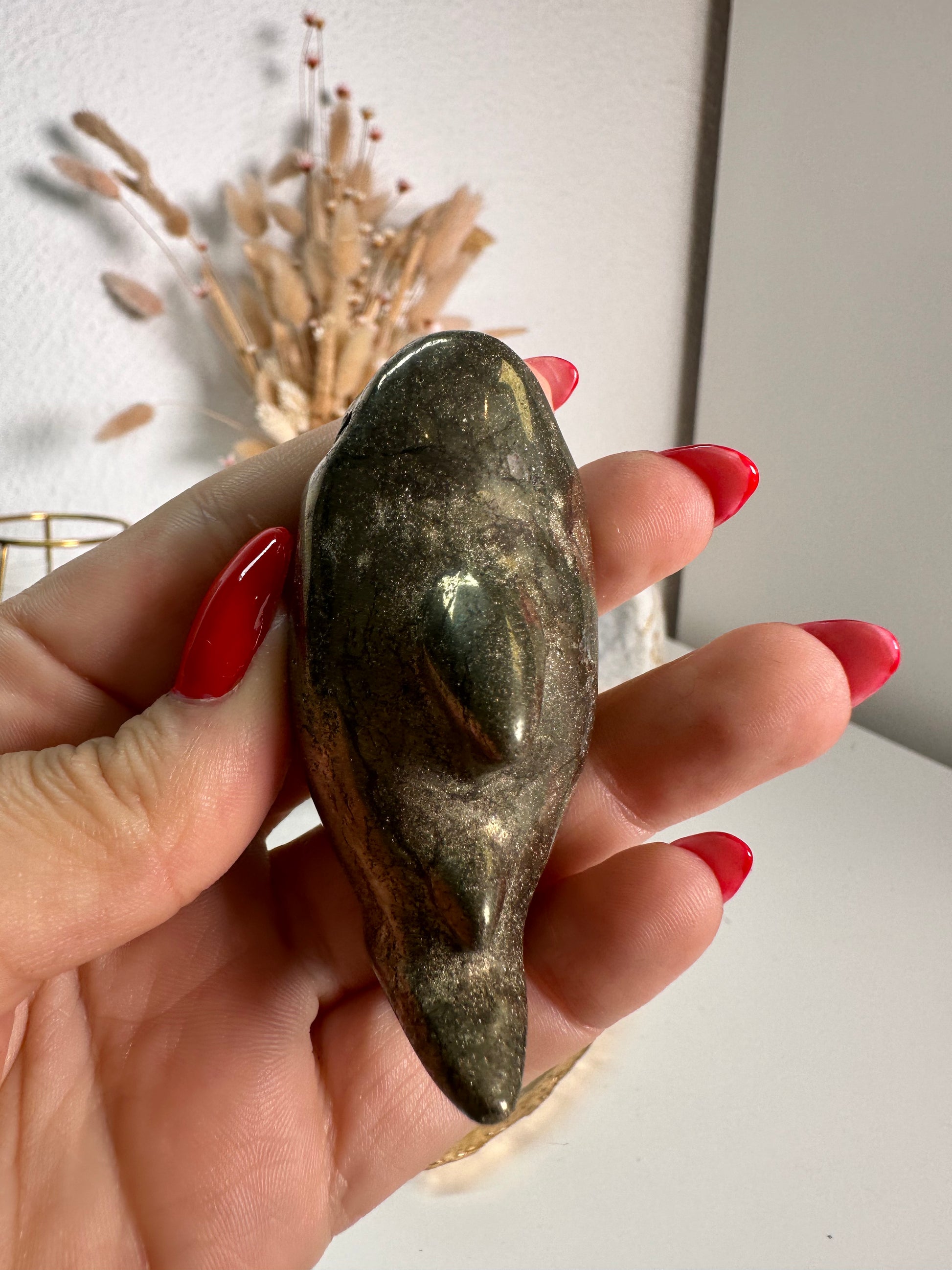 Er wackelt etwas da er entweder rechts oder links auf einer Flosse steht.