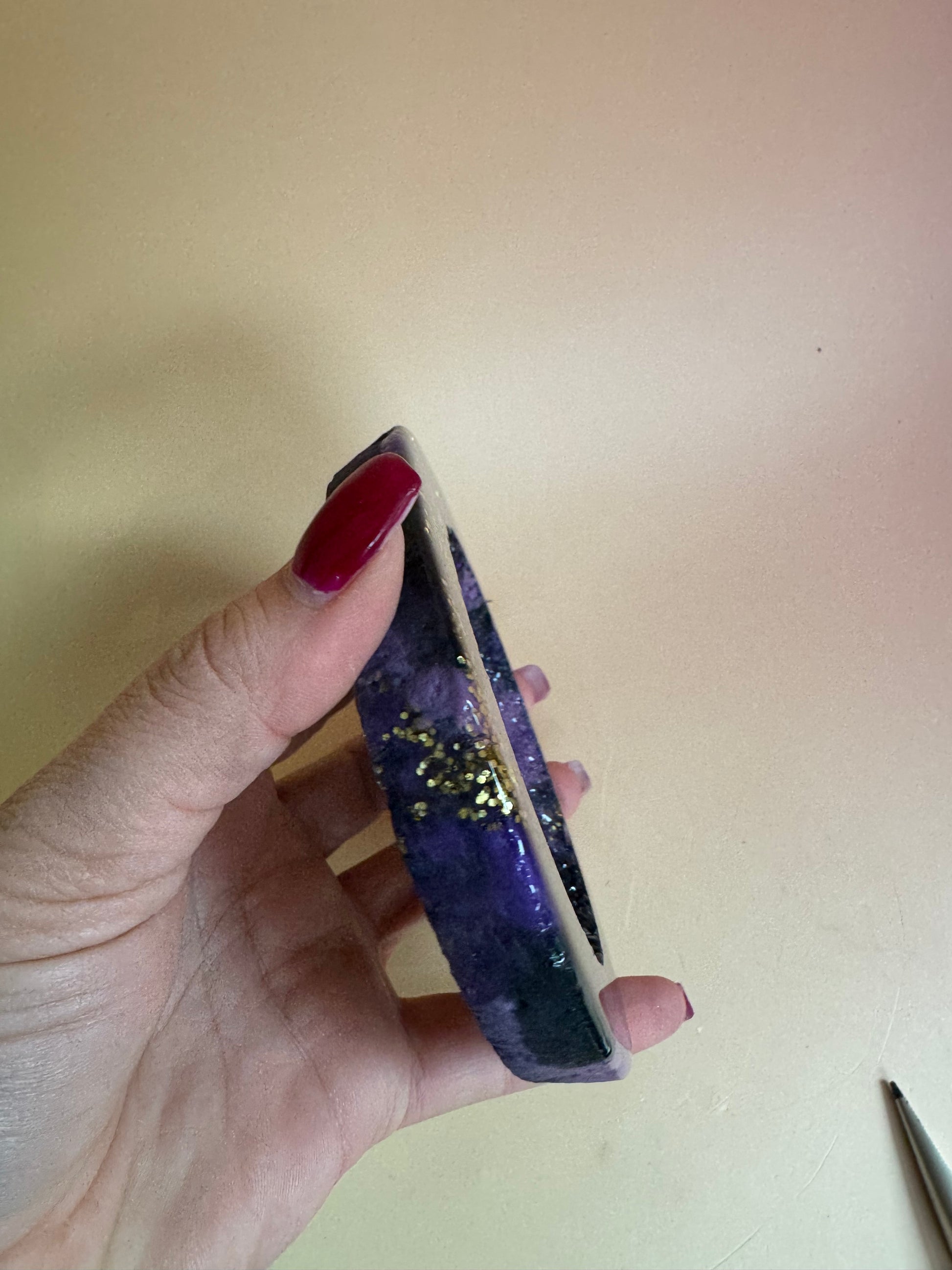 Das Schälchen ist in den Farben lila, schwarz, Glitzer Gold, Glitzer violett