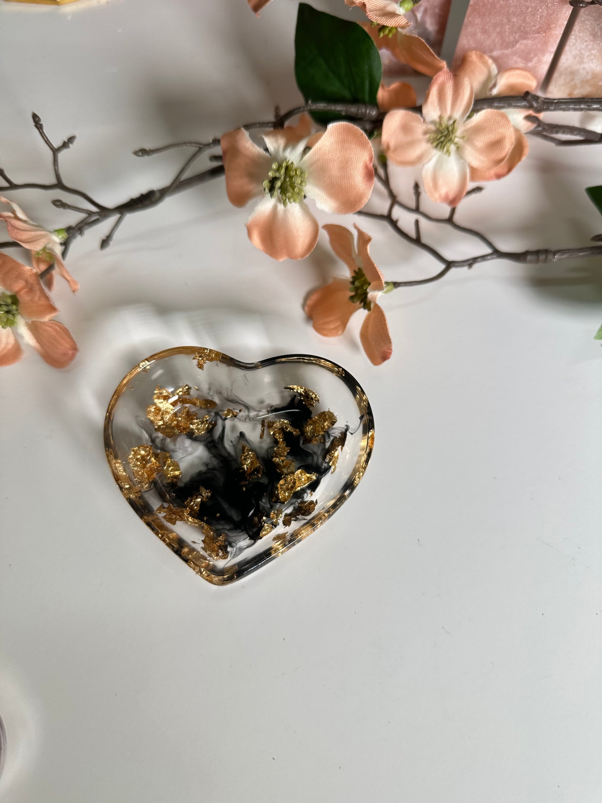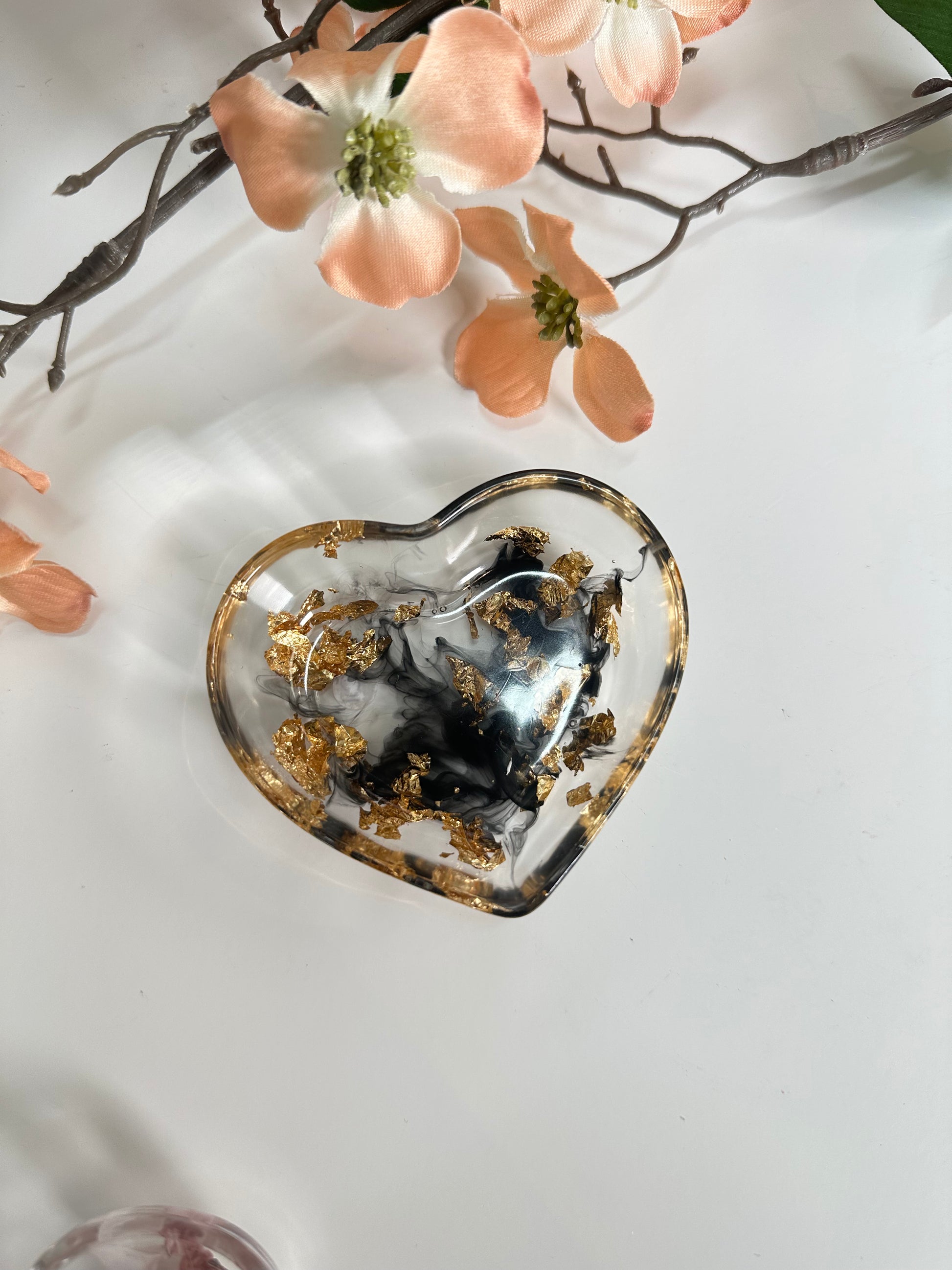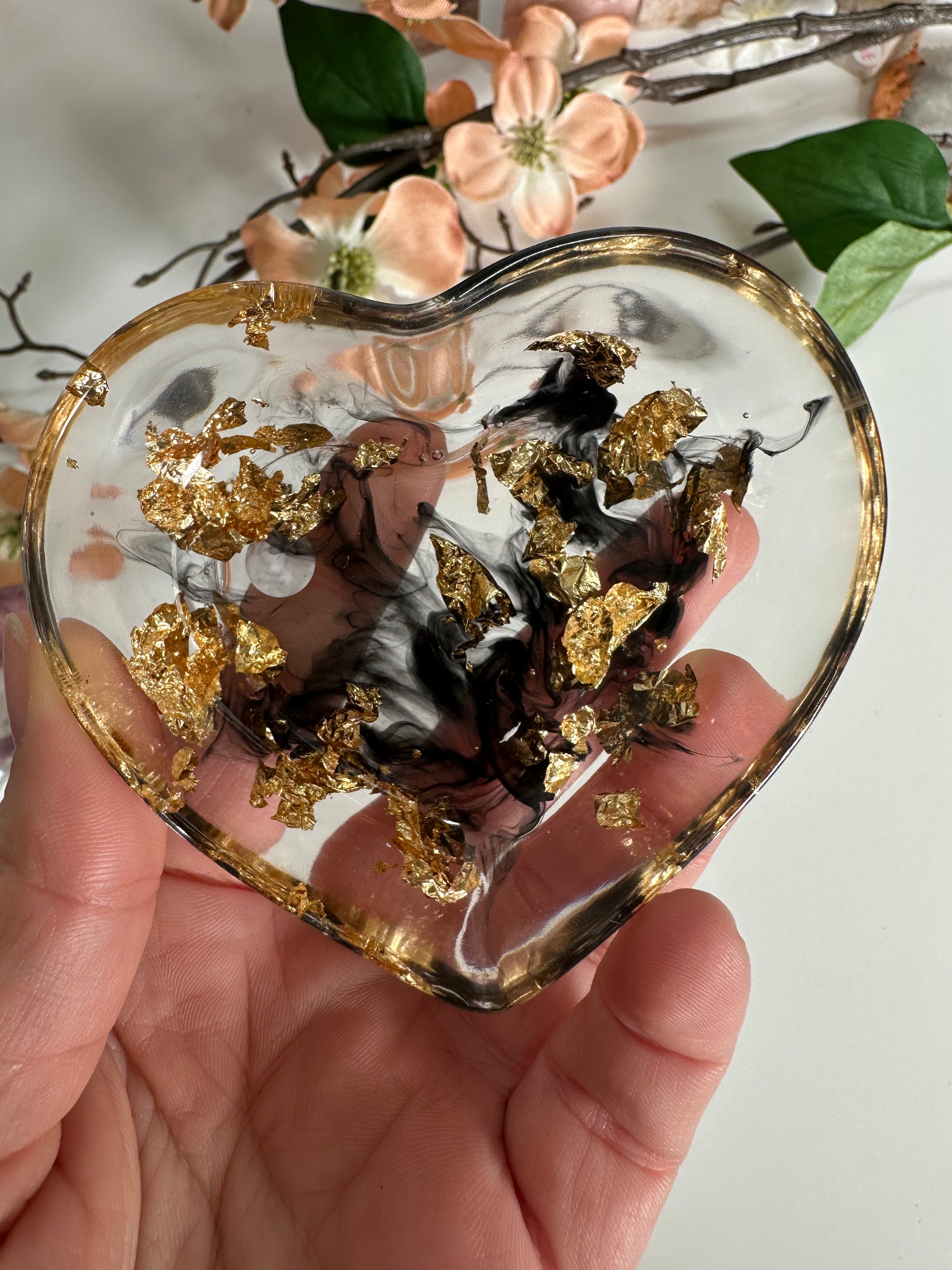 Der Grundkörper ist transparent, darin goldene Blattflocken und schwarze Pigmentpaste.