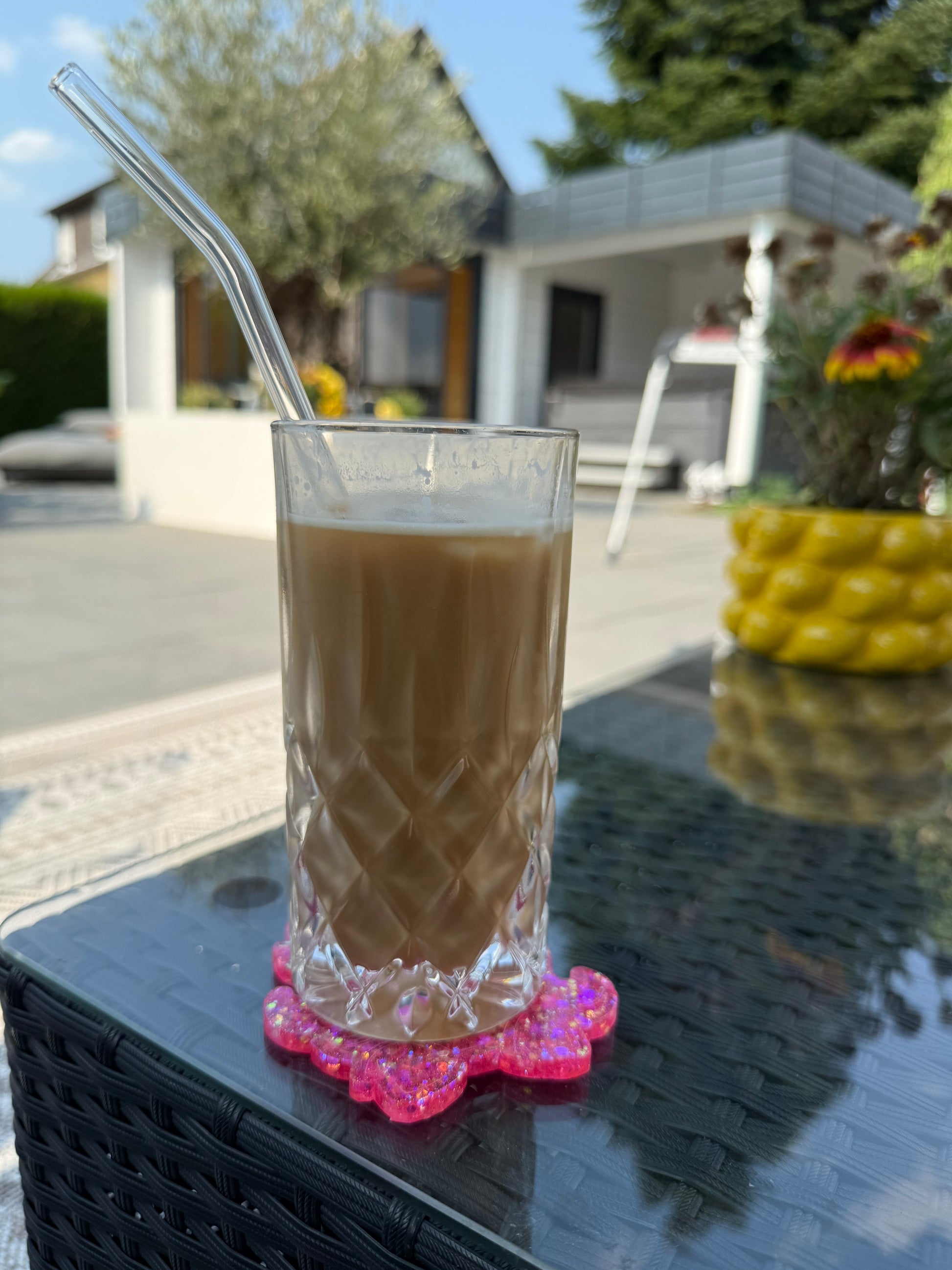 Es ist ein kleinerer Untersetzer um demnach auch eher für kleinere Gläser oder Tassen die unten schmaler werden geeignet.