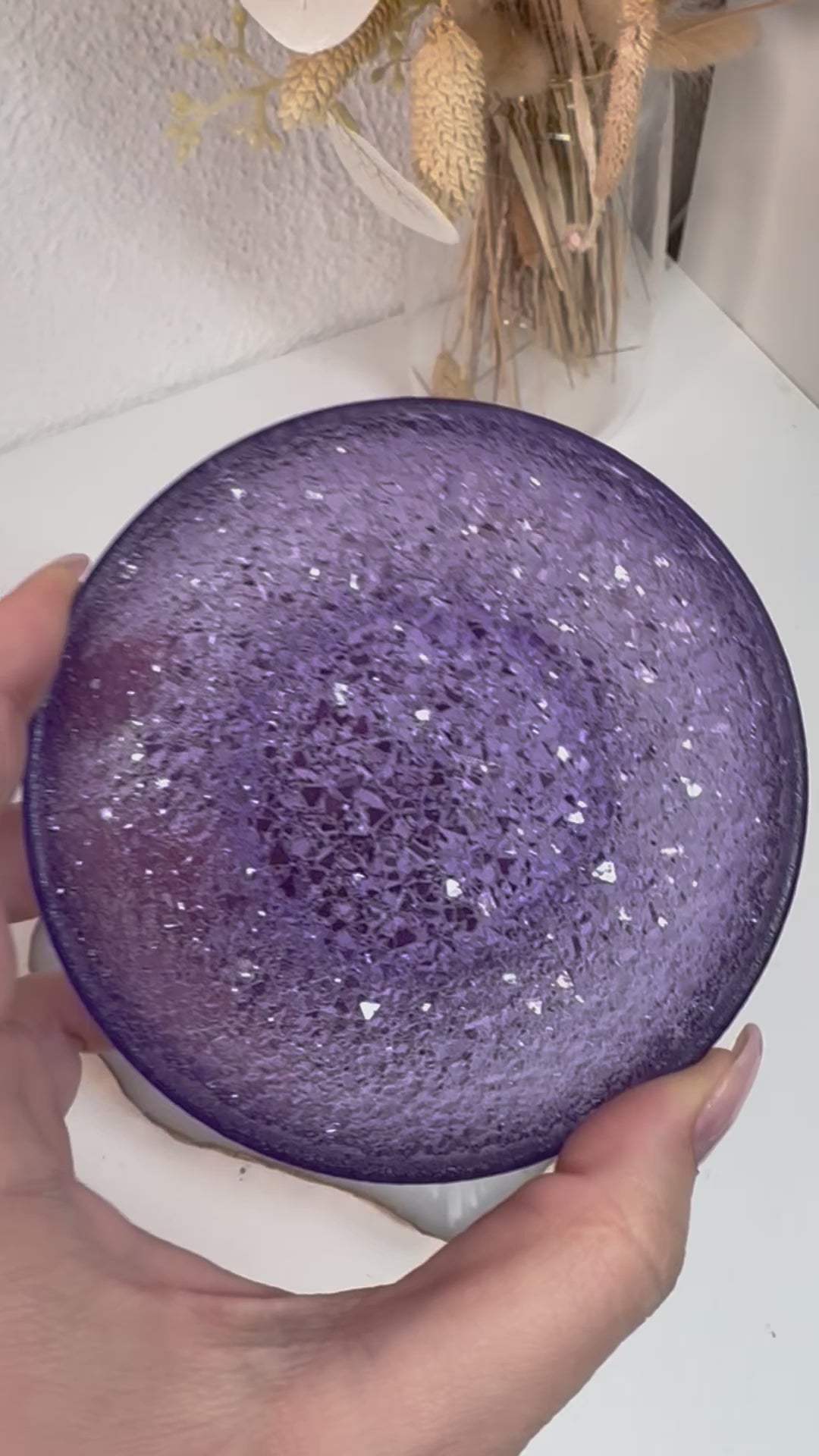 Die Kristalloptik ist auf der Innenseite, mittig mehr als Richtung Rand. Die Außenseite dieser Form hat eine matte Struktur! Dies unterscheidet diese Form zu der anderen runden Form. Außerdem ist diese hier etwas flacher.