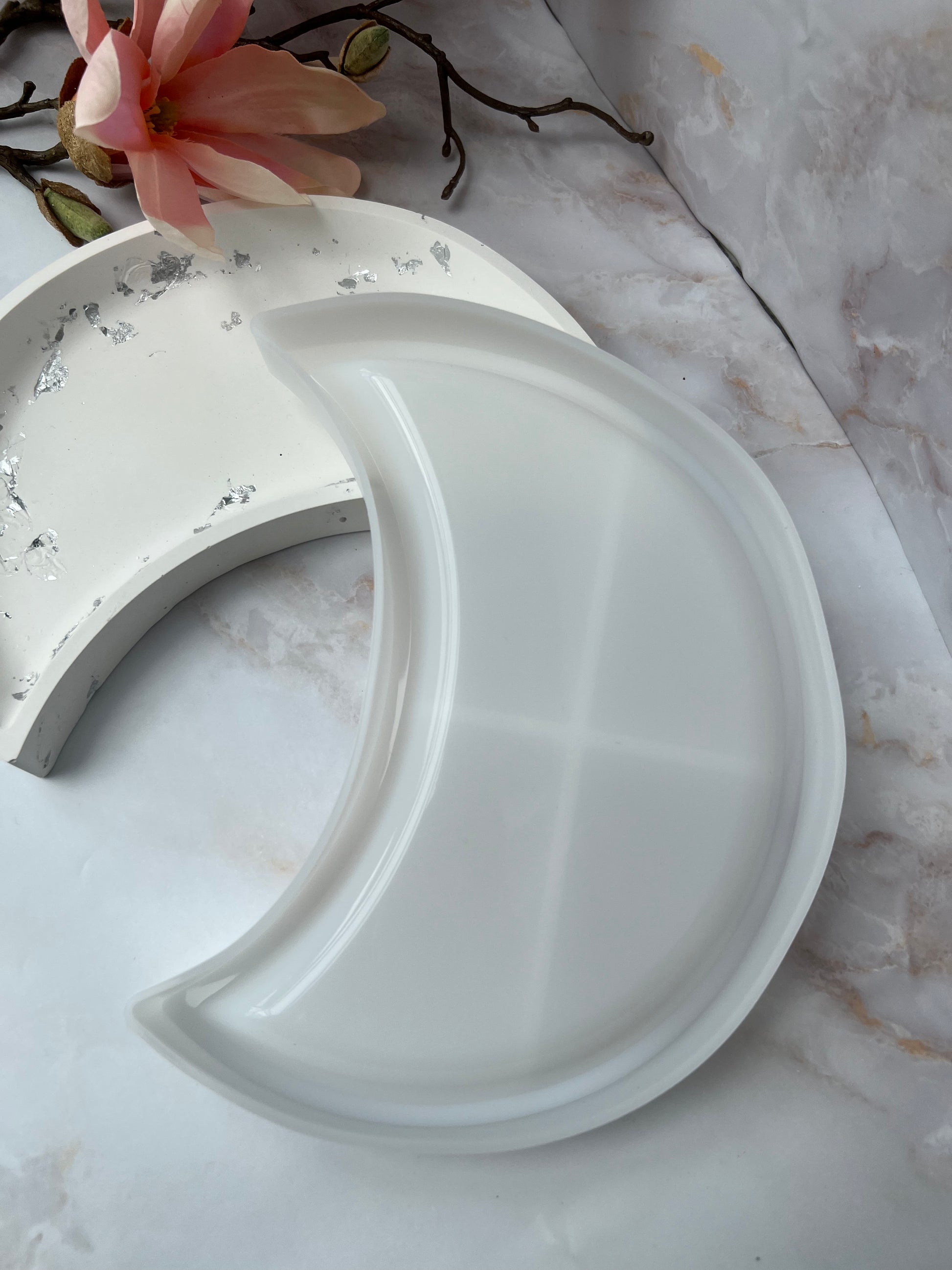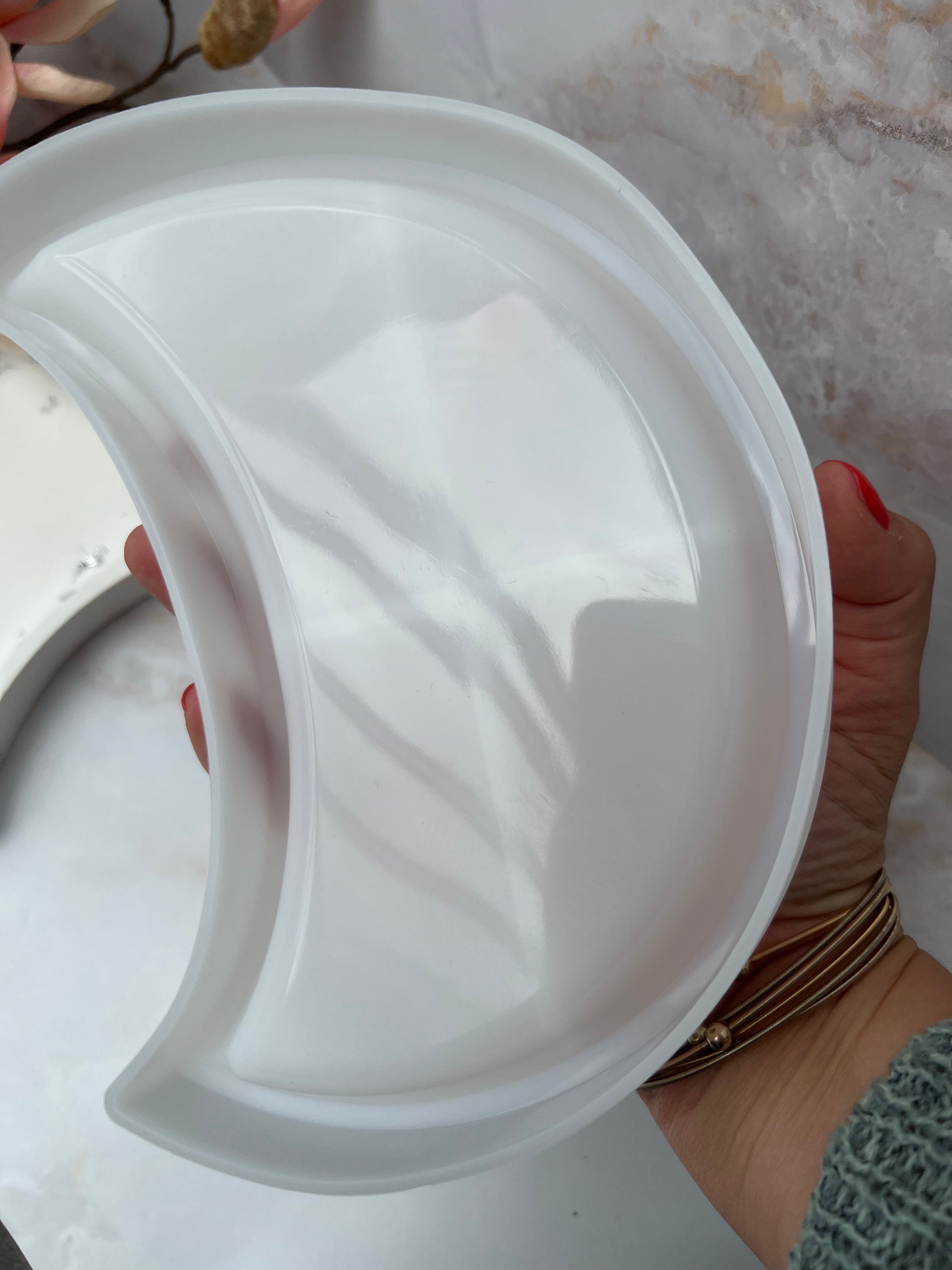 Die Länge des Mondes ist ca. 18 cm (von Spitze zu Spitze gemessen). Durch die Größe sind sie nicht formstabil, das heißt der Rand der Form kann nach innen oder außen gewölbt sein. Ich empfehle die Form zu stabilisieren zum Beispiel durch Klebeband oder Rahmen.
