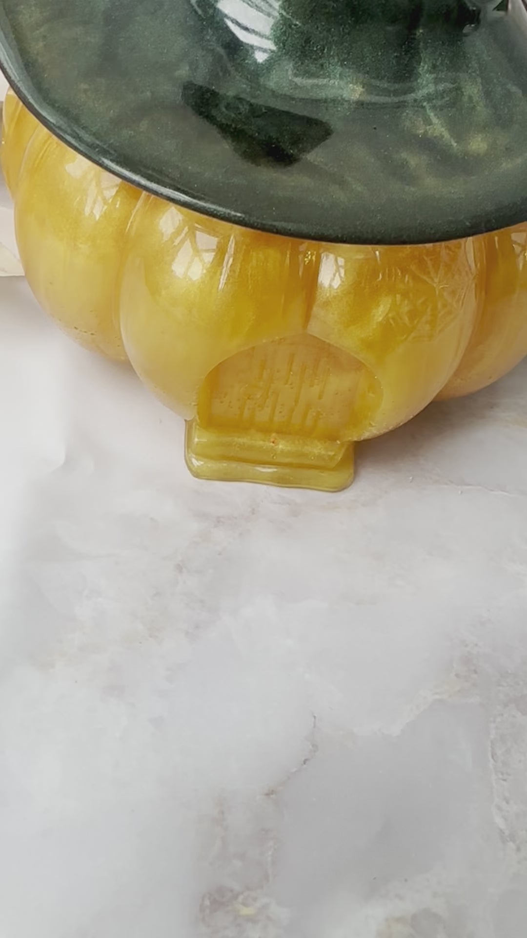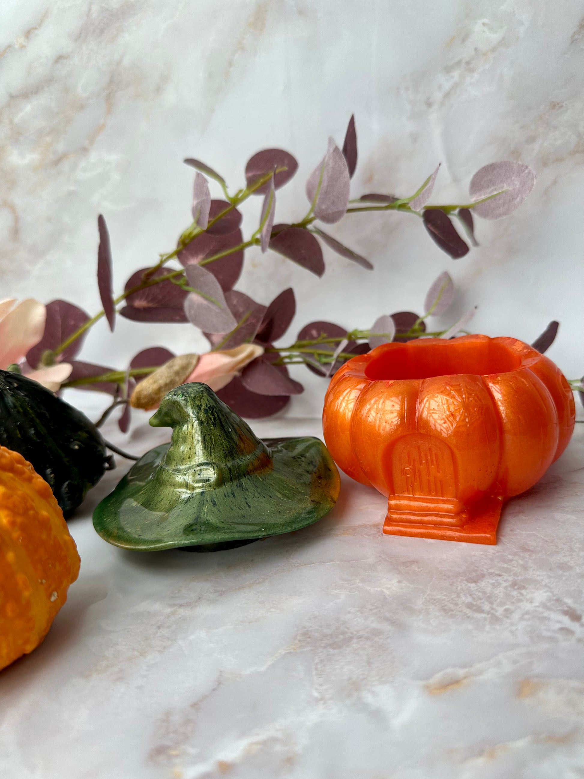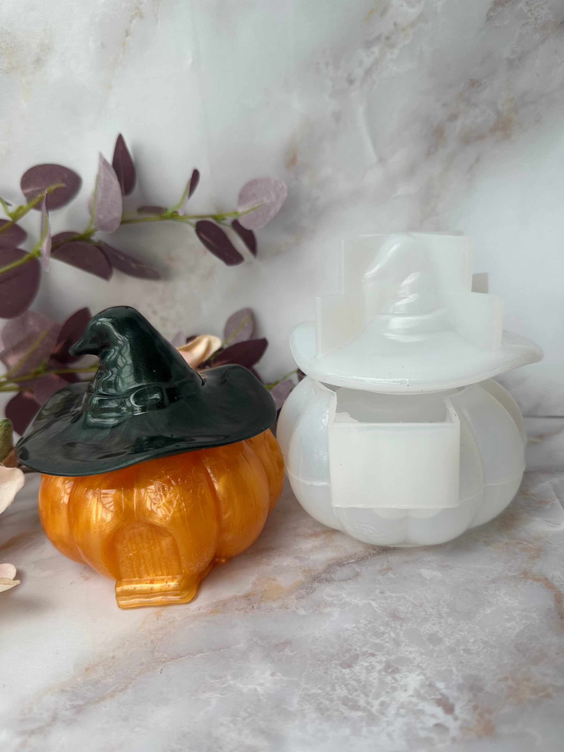 Die Silikonform besteht aus 2 Teilen, einem Unterteil und einem Oberteil, den Hut! Der Hut passt nachher wunderbar als Deckel auf das Kürbis Haus.